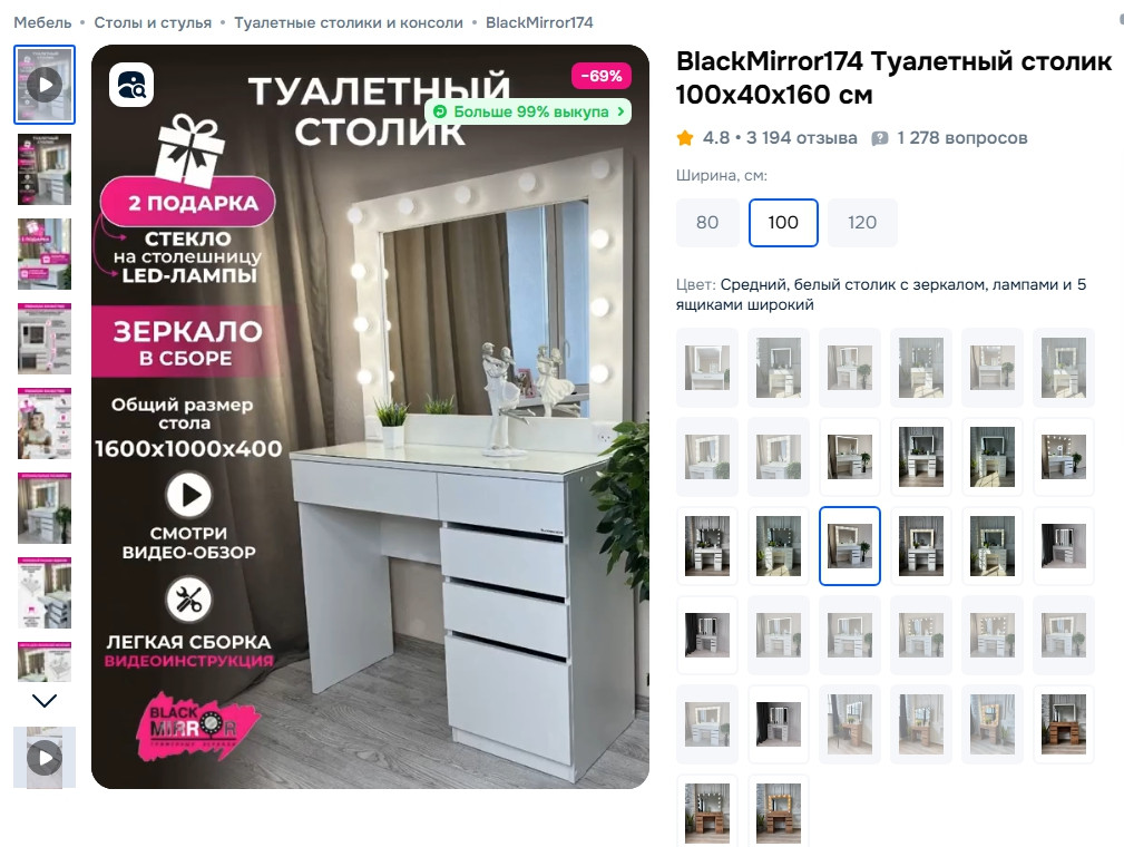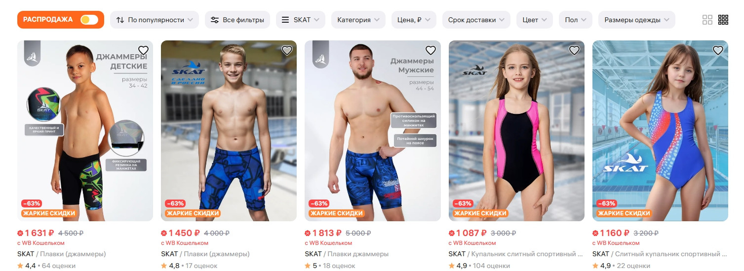 через фильтры — по материалу, цвету, размеру. Товары без отзывов