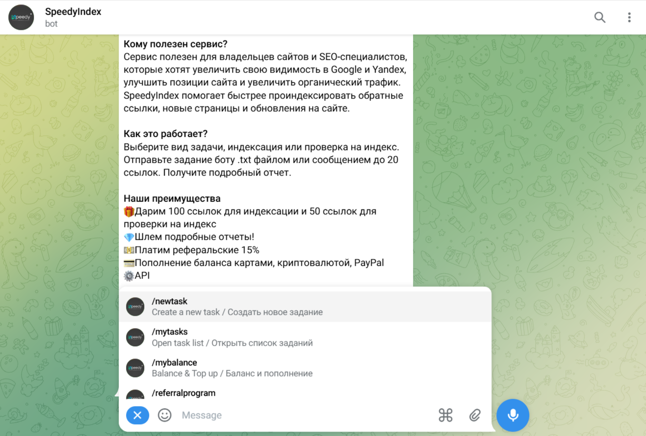 Отправьте список ссылок — в виде .txt файла (до 25,000 URL) или сообщением в бот Telegram (до 20 ссылок). ➤ Шаг 2: Запуск задания Сервис запускает переходы мобильным Google-ботом по вашим страницам. Это означает, что робот действительно посещает URL, как при органическом поиске. ➤ Шаг 3: Ожидайте отчет Через 72 часа вы получаете отчет: какие страницы проиндексированы, сколько дали ошибку 404, сколько еще в процессе. Важно: именно с момента завершения задания начинается отсчет времени индексации. У первых страниц индексация может произойти уже в течение 24 часов. 🎁 Бонус: Каждый новый пользователь бота получает 100 ссылок бесплатно для тестирования сервиса. Отличная возможность убедиться в эффективности перед оплатой. Если ваш сайт не индексируется Google — сначала убедитесь, что нет технических ошибок. Используйте Search Console, проверьте robots.txt и обеспечьте внутреннюю перелинковку. Но если время — критический фактор, а результат нужен быстро, воспользуйтесь SpeedyIndex. Уже через 24 часа первые страницы начнут попадать в индекс, и вы сможете следить за процессом в отчете. Проверьте сами — 100 ссылок бесплатно в Telegram-боте ждут вас.