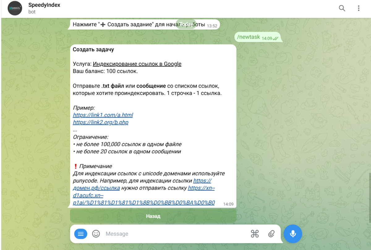 Даже если страница попала в индекс, она может «болтаться» на 20-й странице выдачи. Почему? Потому что контент не отвечает на пользовательский запрос, слишком общий или вторичный. Что делать: Если на новую страницу никто не заходит, поисковик может посчитать ее нерелевантной. Даже 10-20 заходов с внешних источников помогают дать первичный импульс. Что делать: Даже если все сделано правильно, поисковик может «висеть» неделями, не включая страницу в индекс. Особенно это касается новых сайтов и свежих публикаций. Решить проблему помогает SpeedyIndex — сервис, который ускоряет индексацию за счет имитации посещения страницы Google-ботом. Бонус: Каждый новый пользователь получает 100 бесплатных ссылок в Телеграм-боте для тестирования сервиса. Когда вы создаете контент, вы ждете, что он будет работать. Но без индексации он просто «мертвый груз». SpeedyIndex — это способ превратить статью в работающий инструмент, который начнет привлекать трафик как можно раньше. Публикация — это только начало. Чтобы статья попала в выдачу, нужен комплекс мер: техническая проверка, качественный контент, внешние сигналы и ускоренная индексация. Если вы загружаете материалы и не видите движения — действуйте. Используйте все, что работает. А SpeedyIndex — один из самых простых и эффективных способов дать контенту жизнь.