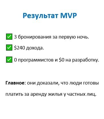 начал с минимального ресурса и конкретной боли рынка. В 2007 году, во время конференции в Сан-Франциско, все отели были переполнены. Основатели — Брайан Чески и Джо Геббиа — сделали простой лендинг, разместили на нем фото своей квартиры и предложили ночёвку на надувных матрасах с завтраком за $80. Это был их MVP: простой сайт, минимум усилий — но чёткое подтверждение гипотезы. Вы