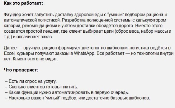 Вы хотели сделать сервис подбора диет через чат-бота. Пользователи не доходят до конца, не отвечают на анкеты. Но в фидбеке читается: «Хочу поговорить с живым специалистом». Вы меняете стратегию: делаете MVP-консьерж с ручной консультацией вместо бота. Если метрики хорошие, а механика понятна, можно переходить к следующему этапу: Пример: