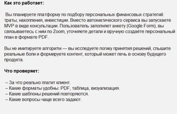 каждый MVP — это сайт или бот. Есть форматы, которые позволяют проверить идею, даже если у вас нет ни строчки кода, ни продукта. Главное — чтобы человек получил полезный продукт, а вы — обратную связь.
