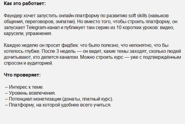 Вы запускаете онлайн-курс по финансам для мам через Google-форму и email-рассылку. Из 100 подписавшихся доходят до конца только 12. Вы получаете от них комментарии и понимаете, что нужно сократить лекции и добавить практику. 3. Экономия времени и ресурсов. Вместо того чтобы 3–6 месяцев «делать всё как надо», MVP можно запустить за неделю. Пример: