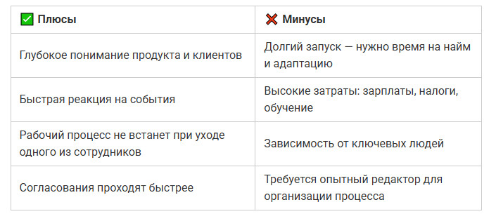 Компания-разработчик CRM-систем сначала работала с фрилансерами. Статьи выходили регулярно, но были слишком поверхностные: авторы не понимали специфику продукта. Руководство решило собрать собственную редакцию — редактора, двух авторов и аналитика. За несколько месяцев они полностью перестроили контент, статьи стали попадать в профессиональные чаты и приносить заявки. Такой результат был возможен только при очень глубоком погружении в продукт — внешним подрядчикам это не удалось.