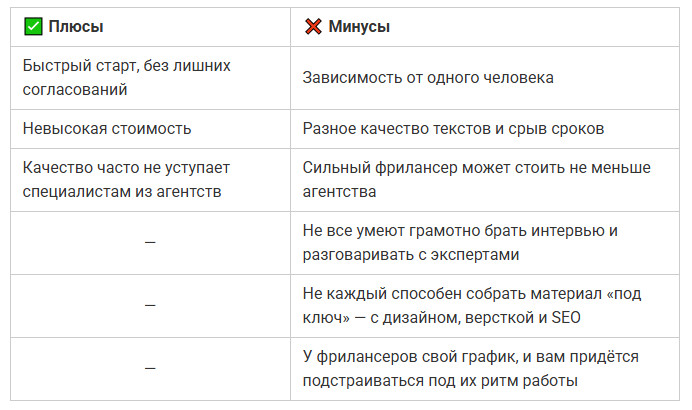 Но за простоту приходится платить временем и стабильностью. Один человек может заболеть, уйти в отпуск или просто не выйти на связь. Уровень качества сильно зависит от конкретного исполнителя: один пишет идеально, другой требует две недели правок. Контроль и планирование ложатся на вас — и если у вас нет времени следить за процессом, велика вероятность провала. Кстати, о причинах подобных провалов подробнее читайте в этой статье.
