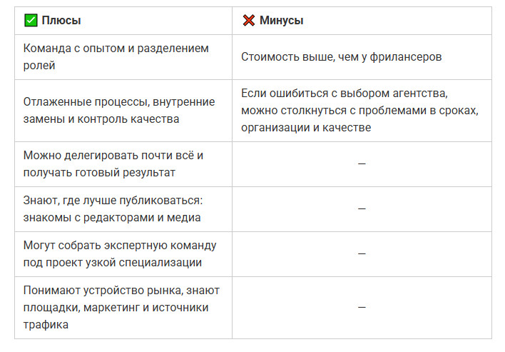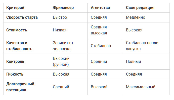 Плюсы и минусы работы с фрилансером Пример: Малый SaaS-сервис начинал с фрилансером. Задача — раз в неделю писать статьи о бизнес-инструментах для салонов красоты. Первые тексты привели немного трафика, но быстро выяснилось: автор не понимает, как работает сам продукт, не может описать реальные кейсы клиентов. Материалы получались общими, без деталей. Компания поняла, что без системного подхода и погружения результата не будет — и обратилась в агентство. Оно взяло на себя основные вопросы, а фрилансер остался на вспомогательных задачах. Агентство — вариант для тех, кто хочет получить систему под ключ: стратегию, контент, визуал и аналитику. Здесь уже не нужно искать копирайтера, дизайнера и редактора по отдельности — все процессы выстроены внутри команды. Вы ставите задачу и получаете результат по графику. Такой формат особенно удобен, когда у компании нет своих специалистов или проект нужно запустить быстро и без проволочек. Агентство может сразу закрыть все направления: от стратегии и позиционирования до публикаций и SEO. Пример: Компания, производящая онлайн-курсы по дизайну, решила передать агентству контент-маркетинг. Студия разработала стратегию, распределила темы по этапам воронки продаж, запустило блог, рассылку и Telegram-канал. Через три месяца компания получила стабильный поток заявок и перестала зависеть от одного исполнителя. Кстати, о том, что такое контент-маркетинг и как он помогает привлекать лиды мы рассказали в этой статье. Перед тем как выбрать, с кем запускать контент-маркетинг — агентством, фрилансером или собственной редакцией — полезно сравнить их по ключевым критериям. Ниже краткая сводка, которая поможет увидеть разницу на одном экране. Каждый формат будет эффективным, если его выбрать под конкретные задачи. Главное — понимать, чего вы хотите достичь: быстрого результата, стабильной системы или полного контроля внутри компании. Когда вы запускаете контент-маркетинг, вам кажется, что первые статьи и клиенты появятся уже через неделю. Но на практике это не так и во многом зависит от того, с кем вы работаете. Итог: скорость старта не всегда значит скорость результата. Быстро запустить можно с фрилансером, но устойчивую систему даёт только налаженный процесс — агентский или внутренний. Перед тем как принимать решение, ответьте на вопросы ниже. Просто отмечайте «да» или «нет» — и по итогам станет ясно, какой формат ближе именно вам. Ответьте «да» или «нет» на 11 вопросов: 📍 Результаты: Если при ответах вы заметили, что «да» оказалось в разных блоках — это тоже нормально. Часто лучший вариант — комбинация, например, агентство + внутренний специалист, который держит процесс под контролем. 1. Можно ли начать с фрилансера, а потом перейти к агентству? Да, можно. Сначала проверяете гипотезы и темы в небольшом объёме, потом масштабируетесь с помощью агентства. 2. Что, если бюджета мало? Начните с малого: 3-4 статьи в месяц в блоге или на тематических площадках. Главное — регулярность. 3. Стоит ли брать авторов в штат? Если контента много и темы требуют глубокого погружения, да. Если задач немного и они разовые — проще работать с агентством. 4. Можно ли поручить всё агентству и не участвовать самому? Можно, но не стоит. Компания должна хотя бы задавать тон и делиться экспертизой. 5. Что делать, если агентство или фрилансер не 