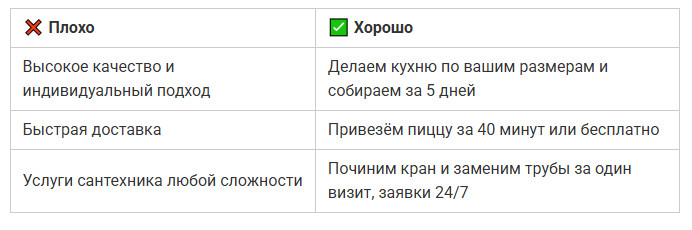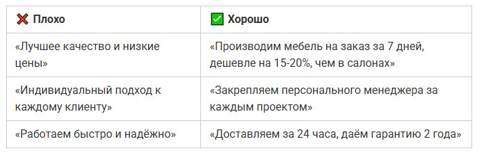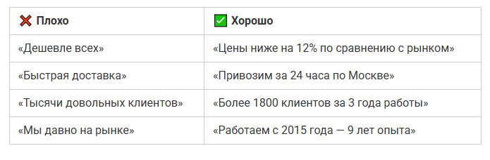 Хорошее УТП всегда звучит конкретно и даёт понять, в чём выгода и почему стоит доверять именно вам.