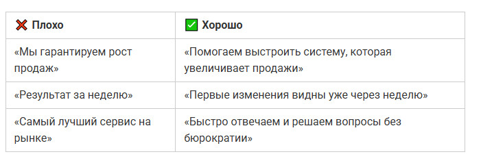 Важно: хорошее УТП не обещает невозможного — оно говорит ровно то, что вы реально делаете лучше других.