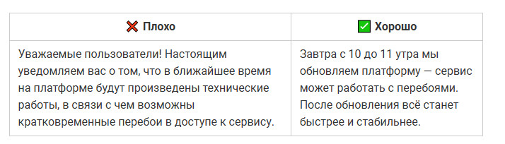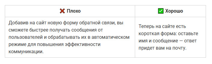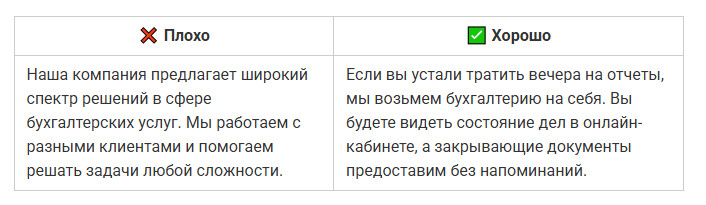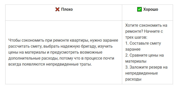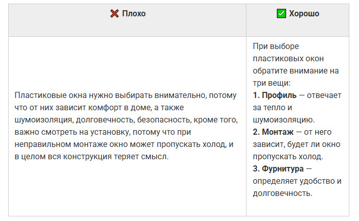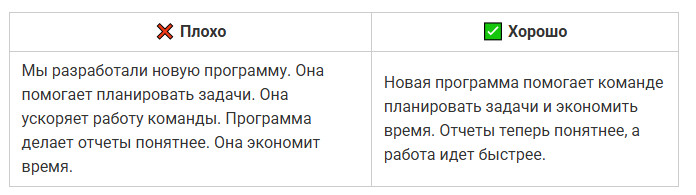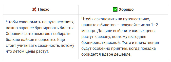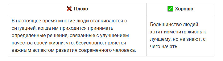 Даже полезный текст можно сделать нечитабельным, если он превращается в сплошную стену. Когда предложение длится полэкрана, мозг спотыкается и человек устает раньше, чем поймет смысл. Во втором варианте мысль та же, но текст читается легко: короткие фразы, четкая структура, ритм. ✅ Совет: одна мысль — одно предложение. Частая ошибка авторов — писать так, будто текст предназначен для отчета, а не для людей. Канцелярит делает фразу тяжёлой, а смысл размытым. Читатель спотыкается на каждом втором слове и теряет внимание. Во втором случае фраза звучит по-человечески: коротко, понятно, без лишних слов. ✅ Совет: если предложение звучит так, как никто не говорит в реальной жизни, перепишите. Канцелярит — главный враг доверия. Даже хороший текст можно утопить, если он выглядит сплошной простыней. Когда нет подзаголовков, списков и логических переходов, человек теряется и бросает читать. Также это важно и для SEO-продвижения статьи. Переходите по ссылке и читайте наше подробное руководство, чтобы статьи попадали в ТОП поисковых систем и приносили стабильный трафик годами. В первом случае — каша. Во втором — порядок, дыхание и логика. ✅ Совет: разбивайте текст на короткие блоки. Подзаголовки, списки и выделения делают материал читабельным даже на бегу. Люди читают глазами, а не только смыслом. Без картинок, схем и акцентов материал кажется тяжелым, и читатель уходит, не дойдя до сути. Второй вариант читается гораздо легче. ✅ Совет: визуал не украшение, а инструмент. Используйте списки, иллюстрации, таблицы или цитаты, чтобы глаз отдыхал, а смысл не терялся. Даже если текст легко читается, это не значит, что он работает. Человек может дочитать до конца, кивнуть и просто закрыть вкладку. Ниже — ошибки, из-за которых материал не вызывает доверия и не побуждает к действию. Текст может быть грамотным и красиво оформленным, но если после прочтения человек не получает ничего практического — он уходит. Люди ищут ответы и решения, а не рассуждения «в целом о важном». В первом случае — общие слова. Во втором человек понимает, что конкретно делать и почему. ✅ Совет: если из текста нельзя вынести хотя бы одно практическое действие, перепишите. Польза — не украшение, это смысл любого материала. Когда текст крутится вокруг компании, продукта или автора, он перестает быть интересным. Люди не хотят читать про вас — они хотят знать, что они получат. Это одна из главных причин, почему ваш контент-маркетинг не дает результата. Вы не одиноки: 9 из 10 компаний размещают контент, который не работает. Чтобы этого избежать, переходите по ссылке и читайте нашу статью. Во втором случае фокус смещен с компании на человека. Читатель видит выгоду для себя, а не заслуги бренда. ✅ Совет: заменяйте «мы» на «вы». Каждый абзац должен отвечать на вопрос читателя: «Что я от этого получу?» Любая тема теряет смысл, если мысли поданы вразнобой. Читатель не обязан сам выстраивать логику. Если после каждого абзаца нужно догонять, о чем речь, текст не сработает. Во втором примере логика выстроена пошагово: сначала билеты, потом жилье, потом эмоции. Читателю не нужно додумывать — он просто идет по маршруту. ✅ Совет: выстраивайте текст по принципу «от причины к следствию» или «от проблемы к решению». Общие слова создают лишь видимость смысла. «Много», «часто», «эффективно» — это пустые формулиров