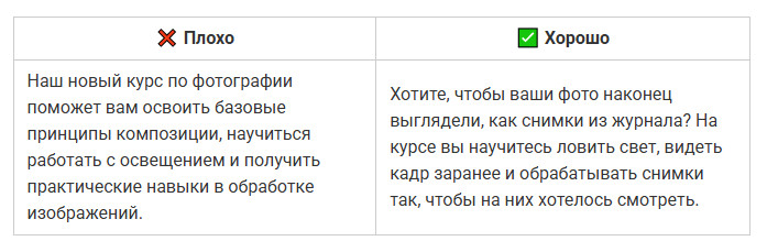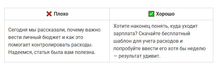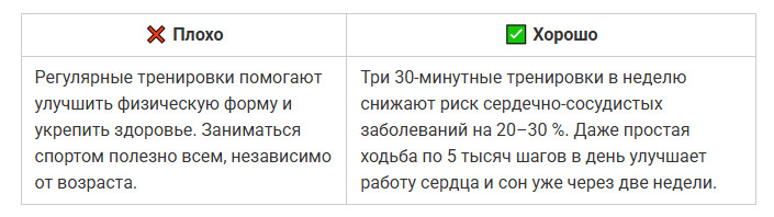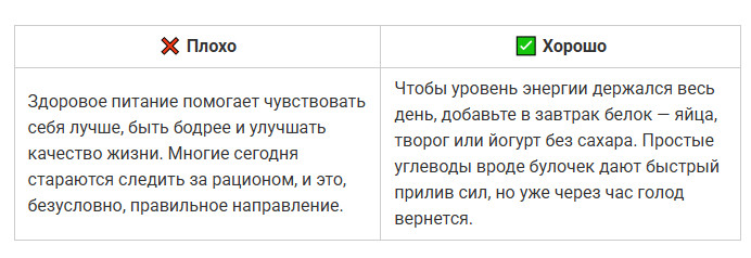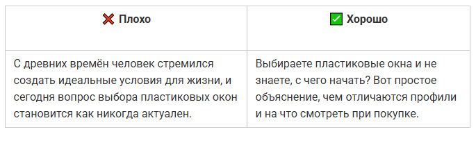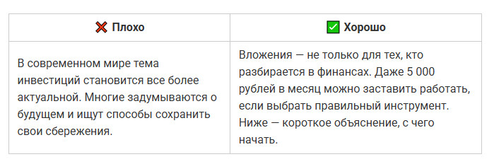 ✅ Совет: открывайте текст с конкретики — вопроса, боли или обещания. Чем ближе первые слова к сути, тем выше шанс, что текст дочитают.