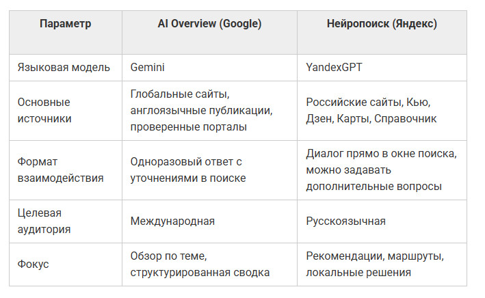 Как это выглядит в работе AI Overview экономит время и помогает понять тему «в двух словах». Но для владельцев сайтов это новая реальность: часть трафика остается у Google. Поэтому тексты теперь важно писать структурировано, с четкими ответами и подтверждением фактов — такие материалы чаще попадают в ИИ-сводки. Хорошие тексты = хороший заголовок, который решает, заметят ли ваш текст вообще. Про создание кликабельных заголовков читайте в нашей новой статье. Нейропоиск — обновлённая версия поиска Яндекса, в которой ключевую роль играет искусственный интеллект. Сервис не просто подбирает ссылки, а пытается понять смысл вопроса и дать развернутый, человеческий ответ. То есть, это российский аналог AI Overview, но со своей логикой и акцентом на локальные данные. Работает Нейропоиск на базе языковых моделей YandexGPT. Эти модели обучены на огромных массивах текстов и умении вести диалог. Когда человек вводит запрос, система определяет его намерение, анализирует контент из разных источников — от статей до карточек в Яндекс.Кью и Дзене — и формирует итоговую сводку. ✏️Пример:Если спросить «куда поехать весной на машине из Москвы», Нейропоиск покажет блок с несколькими направлениями, примерным временем в пути и кратким описанием достопримечательностей. Ниже у него будут ссылки на сайты с маршрутами и подборками от блогеров. Как работает Нейропоиск AI Overview и Нейропоиск решают одну задачу — ускорить поиск ответов, но делают это немного по-разному. Оба инструмента основаны на языковых моделях, которые анализируют не просто слова, а смысл запроса. Разница — в экосистеме, источниках данных и подаче результата. Что у них общего: Чем отличаютс AI Overview делает ставку на скорость и универсальность, а Нейропоиск — на контекст и локальную пользу. Google стремится дать короткий ответ, который сэкономит время. Яндекс, наоборот, старается сопровождать пользователя по всей цепочке поиска: от вопроса до готового решения. Появление поисковых ИИ-сводок стало поворотным моментом для контент-маркетинга. Теперь пользователи всё реже переходят по ссылкам, а ответы получают прямо на странице поиска. Это значит, что привычные стратегии продвижения через статьи и SEO постепенно перестают работать в прежнем виде. С учетом новых требований SEO-оптимизации, чтобы ваши тексты попадали в ТОП поисковых систем используйте нашу подробную инструкцию. Что это значит для авторов и компаний: Для контент-маркетологов это не повод переписывать всё с нуля, а сигнал к адаптации. Нужно думать не о том, «как понравиться алгоритму», а как быстро дать ценность пользователю. Тогда текст одинаково понятен и человеку, и нейросети. ИИ-сводки меняют правила игры, но не саму суть контент-маркетинга. Пользователи по-прежнему ищут честные и понятные тексты, а значит, выигрывают те, кто умеет говорить просто о сложном и давать реальную пользу. Мы помогаем компаниям адаптировать контент под новые форматы поиска — так, чтобы его находили и люди, и нейросети. Напишите мне — обсудим задачу и найдем решение. Если хотите, чтобы ваши материалы проходили редакторскую вычитку и звучали как нужно — обращайтесь, мы поможем. Напишите мне — обсудим задачу и найдем решение.