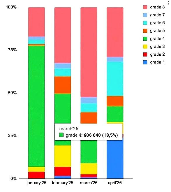 Чтобы не просто раздавать промокоды, а стимулировать рост, мы внедрили грейдовую систему. Восемь уровней: чем выше охват и вовлечённость — тем больше вознаграждение.