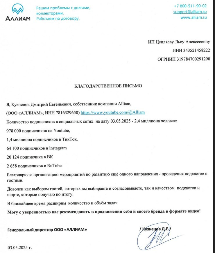 Отзыв по продвижению блогера с совокупным количеством подписчиков - 2,5 млн. человек