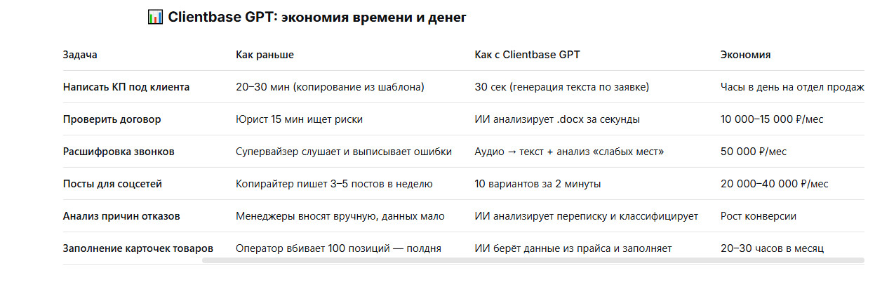 Это не «болталка», которую включил и забыл, а инструмент для «вайб-кодинга». Вы формулируете задачу простым языком, а ИИ её выполняет. Clientbase GPT не просит зарплату, не уходит на больничный. Но он требует внимания и обучения. Тот сотрудник, который раньше делал что-то механически, теперь может (если сможет) переключиться и начать тюнинговать промпты. Такова новая реальность. Мы составили список задач, которые наши клиенты автоматизируют в первую очередь. Выберите свои — и мы настроим это за полчаса. Для отдела продаж: Для контроля звонков: Для работы с документами: Фоновые задачи: Автоматизировав всё вышеперечисленное, вы сэкономите до 100 часов фонда оплаты труда в месяц. Это не громкие обещания, а расчёт на основе реальных кейсов наших клиентов. Вы получаете не готового гения, а способного ученика, которого вы сами доведёте до ума. И он окупит себя очень скоро, если вы правильно поставите задачу. Важно:Вам не нужен отдельный человек для поддержки. Система обновляется сама, резервные копии создаются автоматически, права доступа настраиваются мышкой. ... Сколько времени ваши сотрудники тратят на рутину, которую мог бы взять на себя ИИ за 2000 ₽? Не покупайте кота в мешке. Соберите своё решение за 3 дня бесплатно.