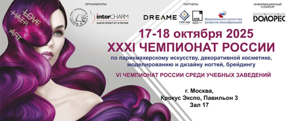 17-18 октября 2025 года в МВЦ «Крокус Экспо» г. Москва, в 3 павильоне, в 17 зале, в рамках 32-й Международной выставки парфюмерии и косметики InterCHARM состоится Финал ХXXI чемпионата России по парикмахерскому искусству, декоративной косметике, моделированию и дизайну ногтей, брейдингу и VI чемпионат России среди учебных заведений.