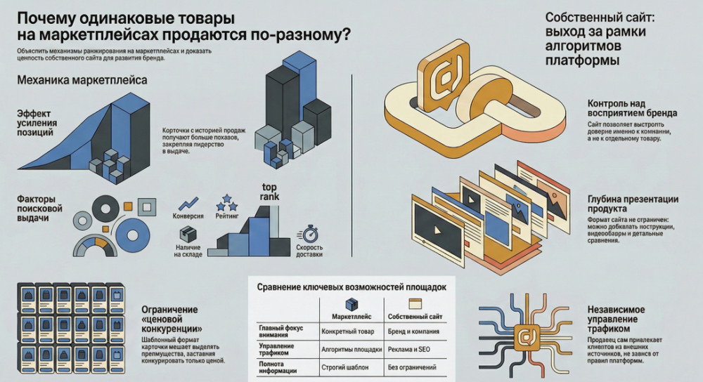 Собственный сайт в этой логике — не замена маркетплейсу, а параллельный канал. На сайте можно подробно рассказать о товаре: расширенное описание, видео, инструкции, сравнение моделей — так, как карточка этого сделать не позволяет. Трафик управляется самостоятельно: реклама, соцсети, поиск. Заказы принимаются напрямую, клиентская база накапливается.