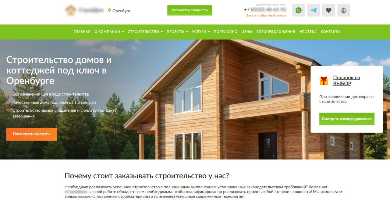 Первые секунды решают все. Если клиенту непонятно, чем вы занимаетесь, он уходит. На главной странице важно не встречать клиента общими словами вроде «строим качественно», а отвечать на три вопроса: