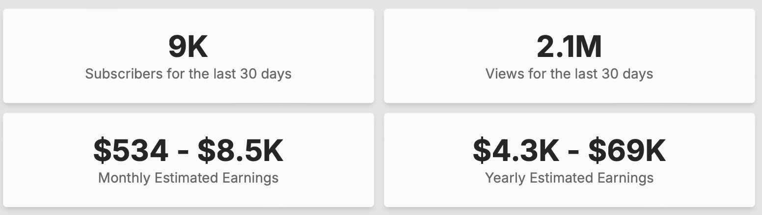 Прошел год. У меня — 222 тысячи подписчиков на YouTube, более 21 миллиона просмотров и стабильный доход от $534 до $8500 в месяц.