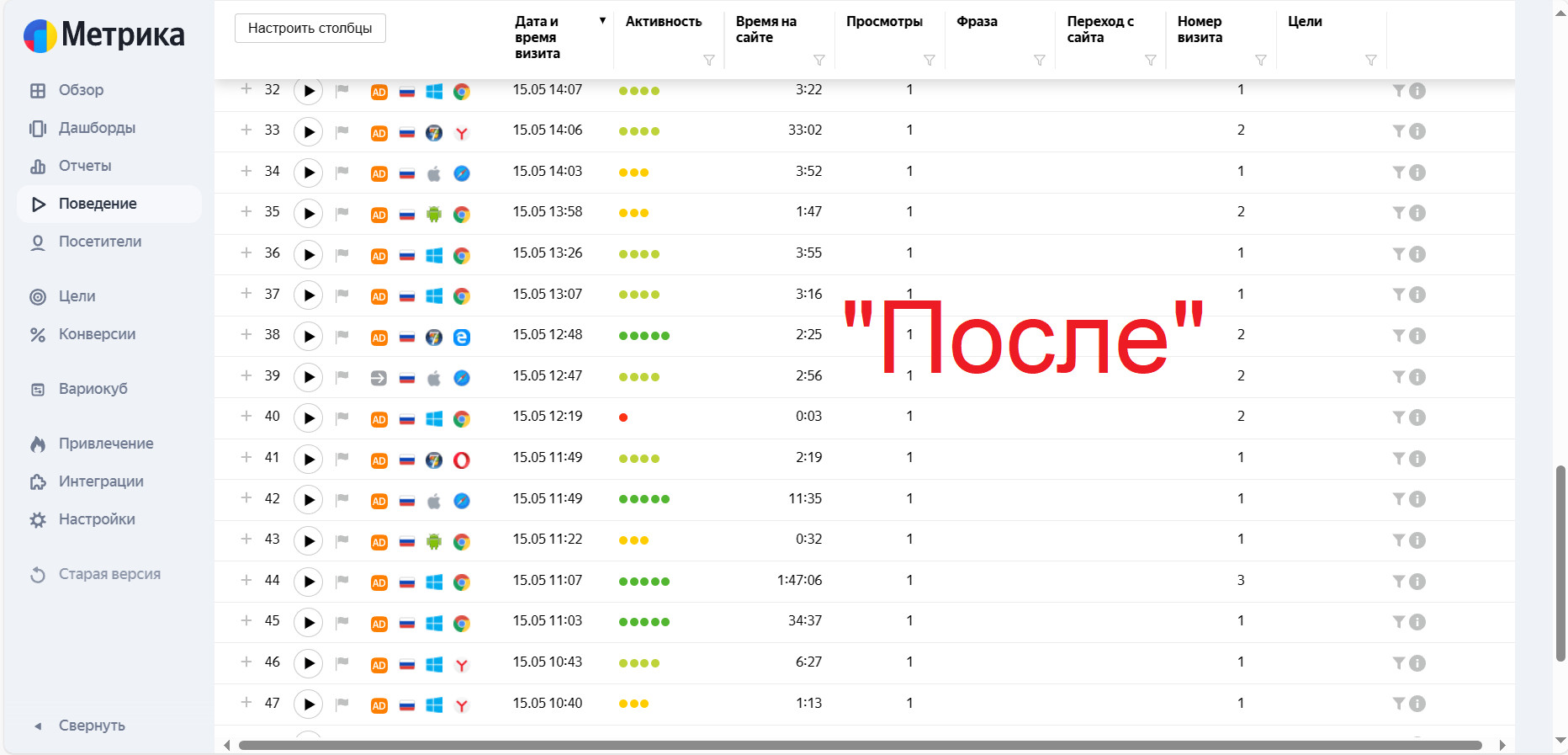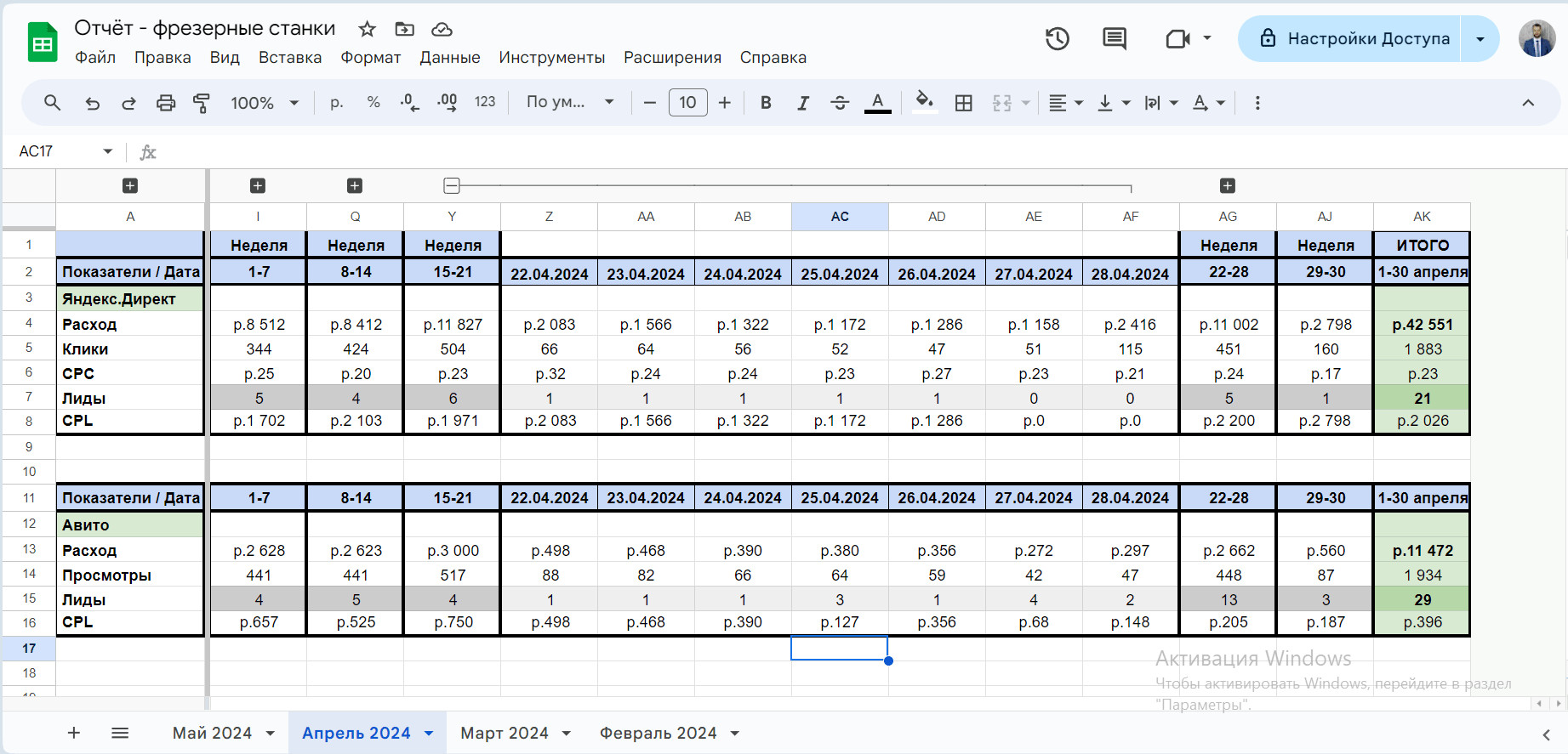 Ниже вы можете увидеть скриншот кабинета Яндекс.Директа за период работы на момент написания этого кейса: Усреднённые результаты от Яндекс.Директа в месяц: Количество лидов можно делать больше, но мы работаем в рамках выделяемого бюджета. Идём дальше. Колл-трекинг — это инструмент, который динамически подставляет уникальные номера телефонов и электронные адреса на вашем веб-сайте для каждого нового посетителя, пришедшего с рекламных кампаний. Когда клиент совершает звонок или отправляет электронное письмо, система точно определяет, с какого рекламного объявления он пришел. При этом сам звонок или письмо перенаправляются на ваш основной номер телефона или адрес электронной почты.Для реализации данной функциональности мы используем сервис Callibri. Есть две главные причины, почему для нас важно отслеживать все лиды, полученные из рекламных кампаний: 1. Для обучения рекламных кампаний в Яндекс.Директе. Чтобы рекламная кампания стабильно приносила результаты, она должна «обучиться» — для этого аналитика должна зафиксировать не менее 10 конверсий в неделю. 2. Для оптимизации рекламных расходов. Мы должны четко понимать, какова окупаемость каждой рекламной кампании (или объявления). Эта система представляет собой дашборд, в котором удобно отслеживать показатели рекламы. Для каждой рекламной кампании строится график, и можно «нырнуть» и посмотреть результат на уровне групп объявлений. Вот так это выглядит: Для заказчика это максимально удобно, потому что можно в 2 клика посмотреть расход и отдачу по каждой кампании/объявлению. Ежедневно анализировали рекламу в Яндекс.Метрике, и корректировали рекламные кампании: В результате получаем поток заинтересованных посетителей, которые активно взаимодействуют с сайтом и оставляют заявки. Ниже вы можете посмотреть на сравнение поведения пользователей на сайте «до» и «после» изменений. Мы составили продающие объявления для каждого фрезерного станка, и подготовили фотографии, которые будут выделять наши объявления на фоне конкурентов. Проанализировали объявления конкурентов на Авито, и составили свои, с учётом всех «фишек», которые уже были на рынке. Посмотрите на скриншот кабинета Avito.Pro за период работы на момент написания этого кейса: Работали с отзывами и вывели в рейтинг 5 звёзд. Большая часть клиентов обращает внимание на отзывы перед тем, как заказать товар. Чисто психологически это располагает к продавцу, и существенно облегчает менеджеру процесс взаимодействия с новым клиентом. Сразу же после постинга объявлений пошли лиды. В этом преимущество Авито — реклама запускается быстро, и начинает действовать мгновенно. А ниже вы можете увидеть отчёт по звонкам с Авито: Ниже вы можете посмотреть на пример отчёта за месяц работы.Таблица учитывает 2 канала трафика — Яндекс.Директ и Авито. Сводные результаты за отчётный месяц: И это не предел, мы можем делать больше лидов, при увеличении рекламного бюджета. Специально для владельцев бизнеса с оборотом от 3 млн.р./месяц, у нас есть предложение: бесплатная онлайн-экскурсия в наш отдел маркетинга. Вот что мы показываем на экскурсии:- Орг.структура отдела маркетинга;- Инструменты директора по маркетингу: таблицы, регламенты, дашборды;- Структура найма и контроля крутых специалистов;- Самое главное: реальные цифры по затратам и выручке. Есл