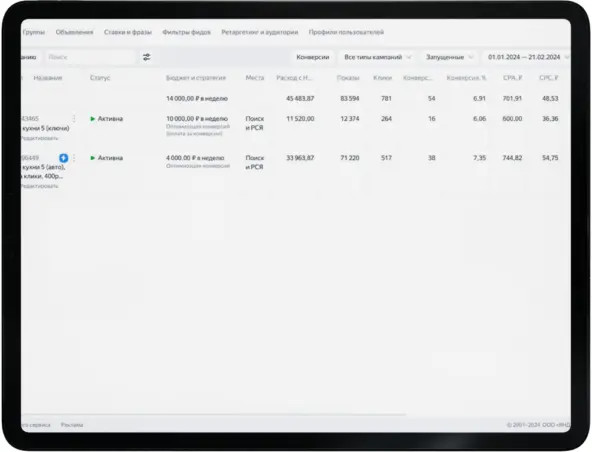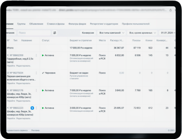 - Рассчитали unit-экономику и выделили для продвижения сегменты для продвижения:- кухни на заказ, в ценовом диапазоне от 150 до 300 тысяч рублей;- шкафы-купе и гардеробные, средним чеком 100 тысяч рублей;
