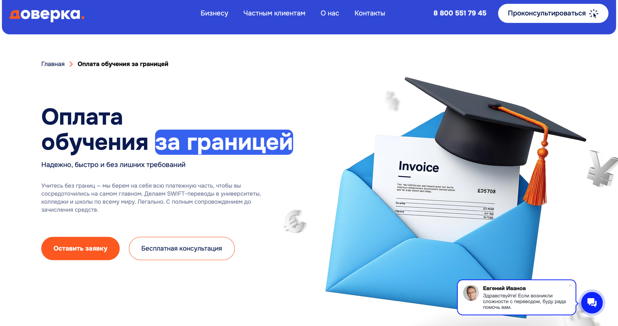 Процесс международного перевода через «Доверку» максимально упрощен и прозрачен. Собственная схема «Доверка» позволяет проводить операции без нарушений законодательства РФ и с учетом всех валютных ограничений. Вот как это работает: Эта схема позволяет бизнесу и частным лицам оперативно решать свои задачи, будь то оплата обучения в Оксфорде, покупка медицинского оборудования в Германии или помощь родственникам в приобретении недвижимости в Дубае. Сотрудничество с «Доверкой» дает клиентам ряд преимуществ, которые делают нас лидером в сфере международных платежей: Вышеперечисленные преимущества делают «Доверку» идеальным партнером для компаний, которые закупают товары за рубежом, и частных лиц, которым нужно оплатить крупные счета за границей. Выбор платежного агента — ответственный шаг, особенно когда речь идет о крупных суммах. Вот на что стоит обратить внимание: «Доверка» отвечает всем этим критериям, что делает нас предпочтительным выбором для международных переводов. Мы понимаем, что для бизнеса и частных клиентов важна не только скорость, но и удобство. Поэтому «Доверка» предлагает услугу «под ключ», которая включает: Например, компания, закупающая медицинское оборудование в Южной Корее, может обратиться к нам с запросом на оплату товаров из-за рубежа. Мы подготовим документы, проведем перевод в течение 24 часов и предоставим подтверждение операции. Аналогично, частное лицо, желающее оплатить лечение за рубежом, получит готовое решение без лишних сложностей. В условиях санкций и валютных ограничений международные переводы могут стать настоящей головной болью. Однако с «Доверкой» вы получаете надежного партнера, который помогает быстро и без рисков перевести деньги за границу. Наша собственная платежная схема, наличие лицензии ЦБ РФ и опыт проведения более 10 000 сделок гарантируют, что ваши средства будут доставлены вовремя и без нарушений законодательства РФ. Будь то оплата учебы за границей, оплата лечения за рубежом, оплата товаров из-за рубежа или помощь близким за рубежом, «Доверка» сделает процесс простым, прозрачным и безопасным. Свяжитесь с нами, чтобы узнать, как мы можем помочь вашему бизнесу или вашим близким уже сегодня! Напишите нам, и получите подробную консультацию сотрудников «Доверка».