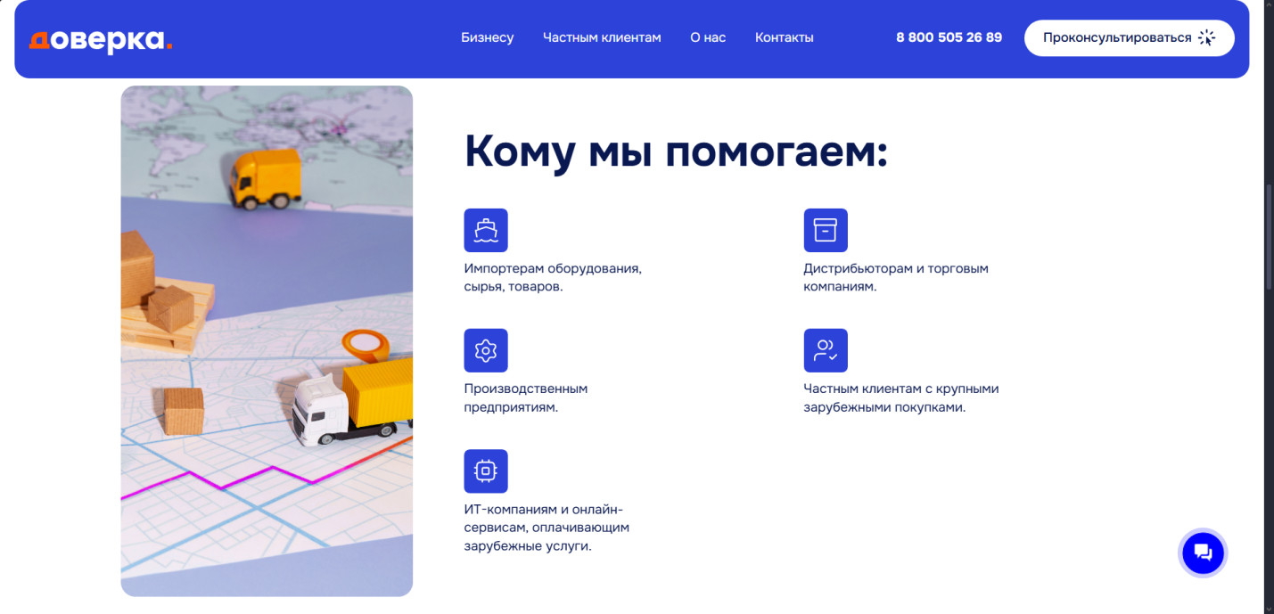 «Доверка» ориентирована на B2B-сегмент, но также работает с частными лицами, чьи транзакции начинаются от 10 000 $. Это не разовые мелкие платежи за подписки или сервисы, а крупные сделки, такие как: