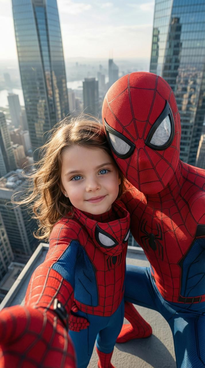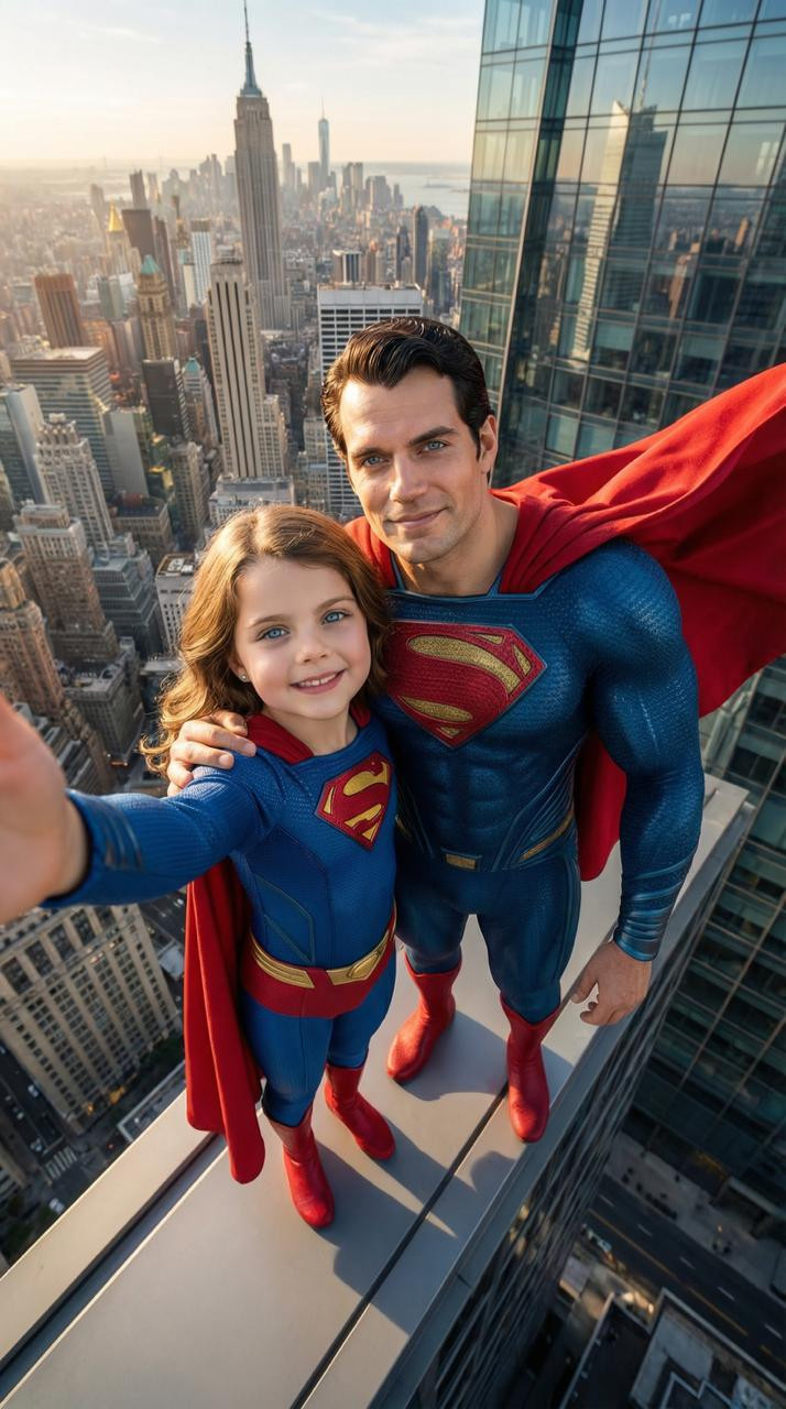 Ultra-realistic close-up selfie POV shot on top of a skyscraper overlooking a modern city skyline, with an adult in a full Superman suit beside a young child. The child wears a miniature Superman suit — blue and red fabric, small S-shield on the chest. She extends her arm toward the camera, as if taking a selfie. Her face is uncovered, natural skin tone, bright eyes, and a smile of pride. Superman, in his iconic suit with cape flying, stands beside her, posing in a fatherly gesture. The backdrop features a breathtaking city skyline bathed in sunlight, with dramatic shadows and soft reflections. The scene is lit with ultra-realistic lighting, mimicking a wide-angle selfie lens with 16K-level detail and natural textures.