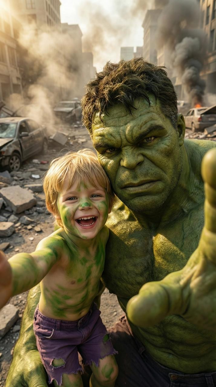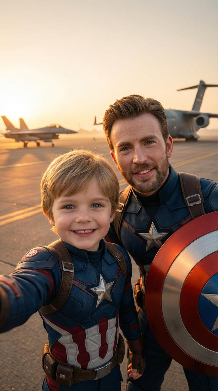 КАПИТАН АМЕРИКА: Промпт:Close-up selfie POV at a sunrise military airbase. A young boy in a miniature Captain America suit holds the camera forward. His face appears natural: soft child skin texture, tiny freckles, gentle shadows, real color transitions, no glossy smoothing. Captain America stands close beside him, shield reflecting warm light. His face is naturally textured with subtle pores, light stubble, natural wrinkles. Background: runway, jet silhouettes, morning haze. Warm soft light, no plastic reflections, natural realism, 24—28mm selfie perspective. ХАЛК: Ultra-realistic close-up selfie POV shot in a destroyed city street with debris and dust clouds. A young boy wearing a tiny «Hulk-inspired» outfit—torn mini purple shorts, playful green body paint in patches—extends his arm toward the camera, laughing. Beside him towers the adult Hulk: massive muscles, green textured skin with pores and veins, expressive face leaning close to fit into the selfie frame. His presence fills most of the image, but both faces remain equally sharp and close to the lens. Background: broken pavement, crushed cars, smoke plumes, sunlight filtering through dust. Dramatic lighting, exaggerated scale, 24—28mm lens distortion, ultra-realistic rendering. Попробуйте сгенерировать в Агрегаторе нейросетей