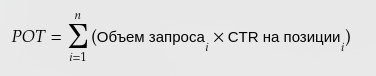 период. Прогноз строится на следующих данных: Формула расчета потенциального органического трафика (POT) выглядит так: Где i — каждый продвигаемый запрос, а CTR на позиции — ожидаемый коэффициент кликабельности для позиции, которую планируется занять (например, 1-3 место). После получения прогноза по трафику, необходимо перевести его в деньги. Для этого используются внутренние метрики бизнеса: Потенциальный доход (Revenue) рассчитывается как: Таким