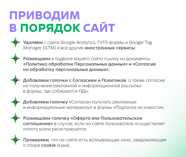 Законодательные требования распространяются на всех без исключения операторов персональных данных. Обратите внимание, что закон касается всех ресурсов, где собираются ПДн: сайт, лендинги, чат-боты, сервисы рассылки и другие. Поэтому ко всем ним нужно еще раз тщательно присмотреться, не осталось ли где-то неучтенных форм сбора данных.Удаляем с сайта Google Analytics, ГУГЛ-формы и Google Tag Manager (GTM) и все другие иностранные сервисы. Если какой-то из иностранных сервисов все-таки хочется оставить, то его использование будет считаться трансграничной передачей данных. В этом случае при подаче заявления в РКН необходимо указать в заявлении, что вы осуществляете такую передачу. Если продолжать использовать иностранные сервисы без уведомления РКН, грозит штраф в размере от 1 млн рублей.Размещаем в подвале вашего сайта ссылку на документы «Политика обработки Персональных данных» и «Согласие на обработку персональных данных». Перепроверьте, что в документах верно расставлены ссылки: Политика ссылается на Согласие, а Согласие на Политику.Добавляем галочки с Согласием и Политикой, а также согласие на получение рекламной и информационной рассылки в формы, где собираются ПДн. Например, если у вас есть форма для сбора заявок в формате «ФИО+номер телефона или электронная почта», то это уже считается сбором ПДн и требует согласия пользователя.Добавляем галочку «Согласен получать рекламные и информационные материалы» в формы «Подписка на новости». Если вы собираете информацию в формате «Электронная почта» без сбора ФИО для рассылки акций, предложений и новостей, то будет достаточно одной галочки "Согласен получать рекламные и информационные материалы«.Размещаем галочку «Оферта или Пользовательское соглашение» в случае, если на сайте пользователь осуществляет оплату и/или регистрируется. Если на вашем сайте есть личный кабинет, в котором пользователь регистрируется и/или каким-либо образом осуществляет оплату, то первая галочка в форме сбора ПДн должна содержать следующий текст: «Я принимаю условия Оферты, а также даю согласие на обработку персональных данных на условиях Политики обработки персональных данных». Обратите внимание, что Оферта и Политика обработки данных должны быть кликабельны и вести на соответствующие документы.Проверяем, что на сайте есть всплывающее окно, уведомляющее о сборе cookie (куки). Если на сайте установлена Яндекс метрика или другие счетчики, то должно быть и уведомление о сборе и хранении данных пользователя. Проверяем чат-боты (если вы собираете данные или принимаете оплату через них) В боте при сборе ПДн должна быть надпись «При нажатии на кнопку „Ваше название кнопки“ я даю согласие на обработку персональных данных на условиях Политики обработки персональных данных». Если осуществляется оплата или регистрация, соответственно текст меняется на «Нажимая на кнопку „Название кнопки“, я принимаю условия Оферты, а также даю согласие на обработку персональных данных на условиях Политики обработки персональных данных» ______________________________ Напоминаем, что в обоих случаях ссылки на документы должны быть кликабельны.Обратите внимание, что таким образом нужно проверить все ресурсы компании/организации: лендинги к мероприятиям, квизы, рассылки, чат-боты. Потому что на всех них распространяются новые правки. Если вы хр