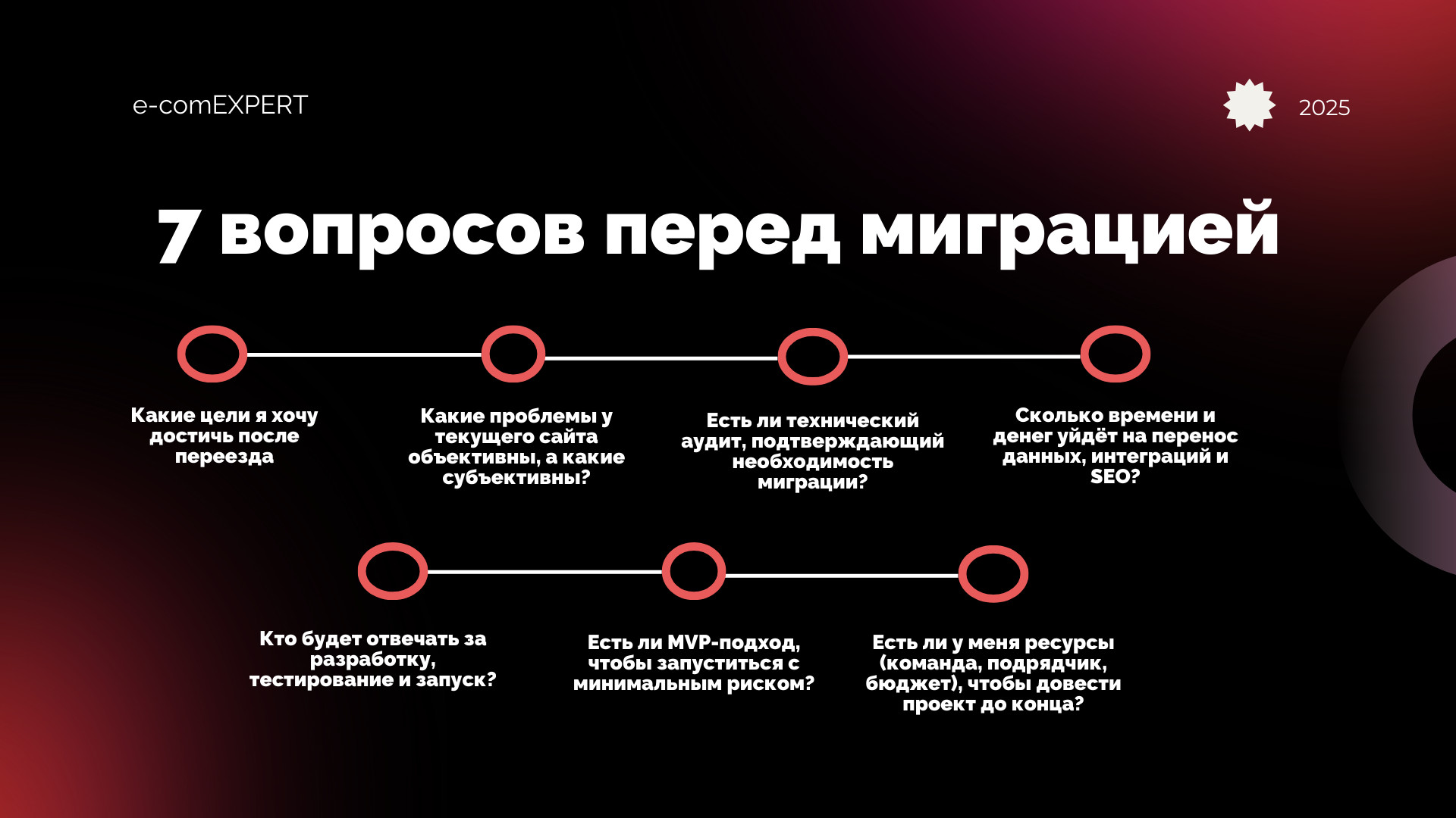 Если вы не уверены, нужна ли миграция — начните с технического и бизнес-анализа. Иногда достаточно обновить текущую систему. А иногда — единственный путь вперёд — это новый старт. Прежде чем принимать решение, ответьте на эти 7 вопросов — они помогут взвесить риски, бюджет и наметить цели. В завершение Миграция — это не просто «смена движка». Это переход от хаоса к системе, от ограничений — к возможностям. Если ваш бизнес уперся в потолок возможностей платформы — пришло время двигаться дальше. Запишитесь на аудит в e-comEXPERT — в течение 5 дней вы получите расчёт экономического эффекта и план внедрения под ваши задачи.