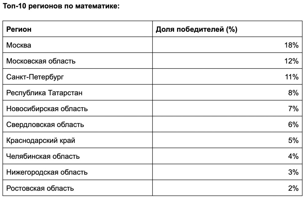 По данным исследования результатов решения задач по математике в топ-10 регионов вошли: Москва (18% победителей), Московская область (12%), Санкт-Петербург (11%), Республика Татарстан (8%), Новосибирская область (7%). Жители Москвы и Подмосковья составляют почти треть всех победителей по этой дисциплине. Также выделяются сильные математические школы в Сибири и Поволжье.