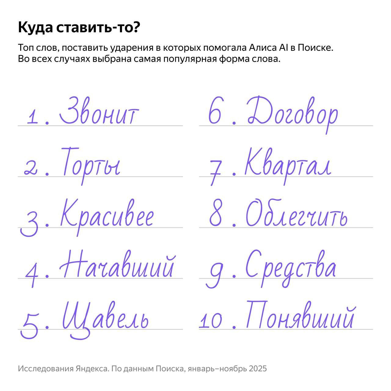 В 2025 году Алиса AI в Поиске чаще отвечала про ударение в следующих словах: