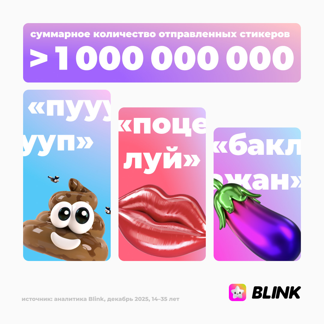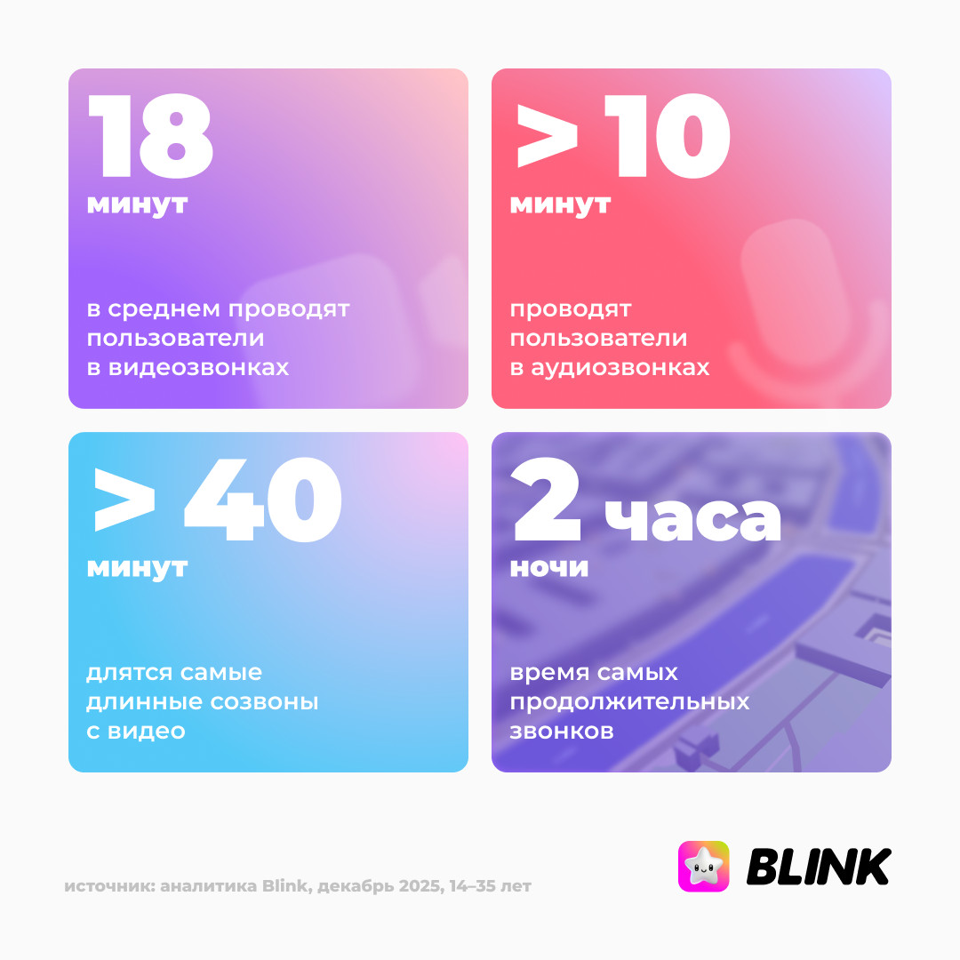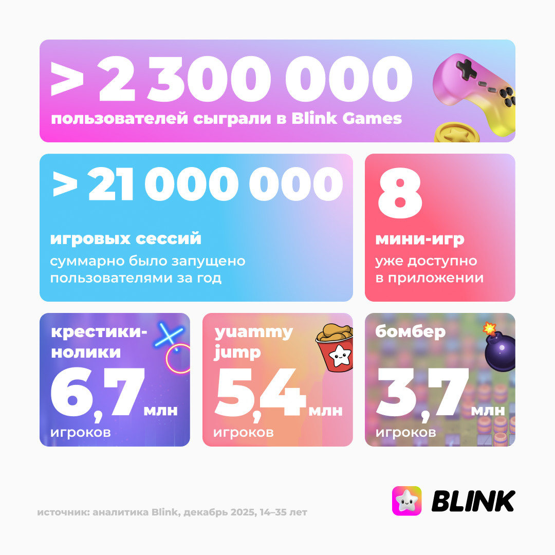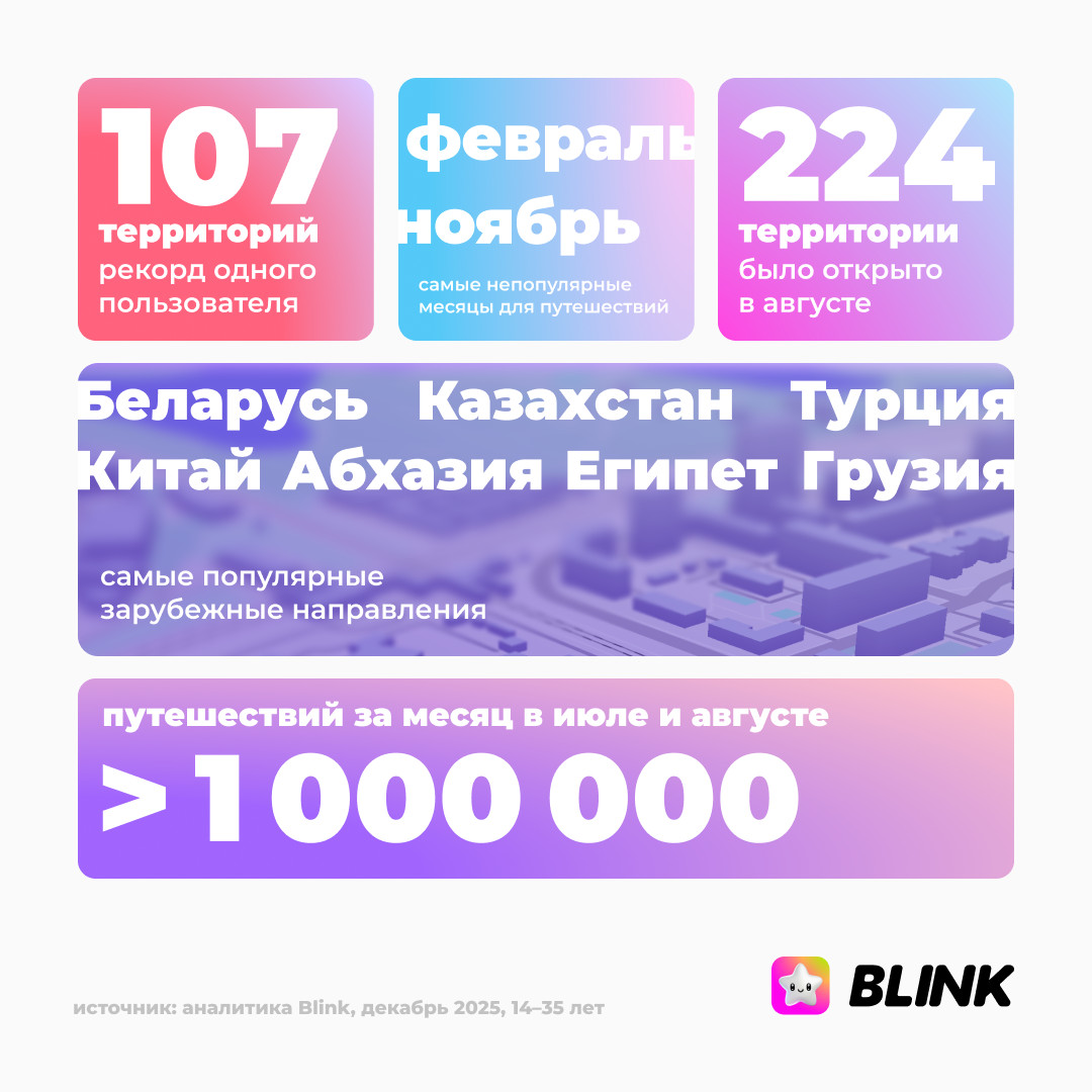 Часть встреч пользователи дополнительно отмечали внутри приложения при помощи специальной функции «трях» — она позволяет зафиксировать момент совместного нахождения рядом и поделиться им с другими через одновременное потряхивание телефонами с открытым приложением Blink. Всего за год было зафиксировано более 12 млн таких отметок. В 2025 году пользователи Blink активно путешествовали: в среднем каждый посетил минимум одну страну в течение года, а максимальное количество поездок одного пользователя достигло 107 стран и территорий. Наиболее популярными зарубежными направлениями у молодёжи стали Беларусь, Казахстан, Турция, Китай, Абхазия, Египет и Грузия. Пик путешествий пришёлся на июль и август, когда число путешествующих превышало 1 млн пользователей в месяц. В августе было зафиксировано наибольшее количество «открытий» — пользователи оказались в 224 новых для себя странах и территориях. Реже всего в поездки отправлялись в феврале и ноябре. В 2025 году пользователи Blink отправили друг другу более 1 млрд аудиостикеров. Для молодой аудитории это один из ключевых способов общения на карте с друзьями — стикеры часто заменяют текстовые сообщения и позволяют быстрее передать эмоцию, обратить на себя внимание или начать диалог. Самыми популярными аудиостикерами стали «пуууп», «поцелуйчик» и «баклажан». Они чаще других использовались пользователями в качестве реакций и коротких сигналов внимания, заменяя полноценные сообщения. Осенью 2025-го в Blink появился новый формат общения — аудио- и видеозвонки, доступные только между друзьями. Их запуск расширил сценарии коммуникации внутри сервиса и стал важной частью повседневного общения молодёжи. В среднем пользователи проводят в видеозвонках около 18 минут, а в звонках только с голосом — более 10 минут. Самые продолжительные беседы с видео длились свыше 40 минут и чаще всего происходили ночью — после 2:00. В июне 2025 года в Blink появились встроенные мини-игры. С момента запуска в них сыграли около 2,3 млн пользователей, которые суммарно запустили более 21 млн игровых сессий. На декабрь 2025 года в Blink доступно 8 мини-игр. Наибольшей популярностью у молодёжи пользуются классические «Крестики-нолики» — в них сыграли 6,7 млн пользователей. Далее следует Yummy Jump — одиночная игра с прыжками по платформам — с 5,4 млн игроков, а также «Бомбер» — мультиплеерная аркада с соревновательным форматом, которую запустили 3,7 млн пользователей. Игры стали ещё одним способом провести свободное время с друзьями, не выходя за пределы любимого приложения. Помимо популярных тайтлов, пользователям также доступны «Дурак», «Шахматы», «Плитки», Astro Fall и Blink Blast. В течение 2025 года команда Blink расширила сценарии повседневного общения и взаимодействия внутри приложения. Для быстрой связи стали доступны голосовые сообщения с автоматической расшифровкой, а для спонтанного общения был запущен формат «Одноразок» — фото и видео, исчезающие после одного просмотра. Для офлайн-взаимодействия появились новые инструменты. Функция «Люди вокруг» показывает примерную геолокацию пользователей в радиусе до 3 км, а кнопка «Бззз!» позволяет мгновенно привлечь внимание друга рядом с помощью вибраций и уведомлений. Развитие получили и элементы геймификации. Система ачивок за чекины и функция «Твой мир» для отслеживания и сравнения личной карты 