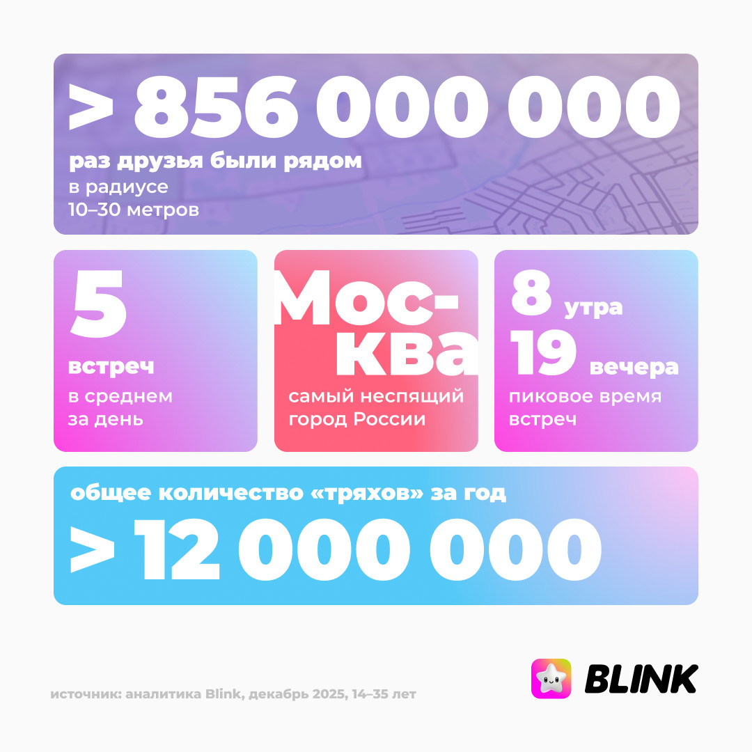 2025-й для пользователей Blink был насыщенным на офлайн-взаимодействие. За год было зафиксировано более 856 млн случаев, когда друзья оказывались рядом — в радиусе 10–30 метров — и узнавали об этом через приложение. В обычный день у пользователей случалось в среднем около 5 встреч, чаще всего — по пятницам. Реже всего друзья виделись в декабре, когда многие предпочитали проводить время дома из-за наступившей зимы.