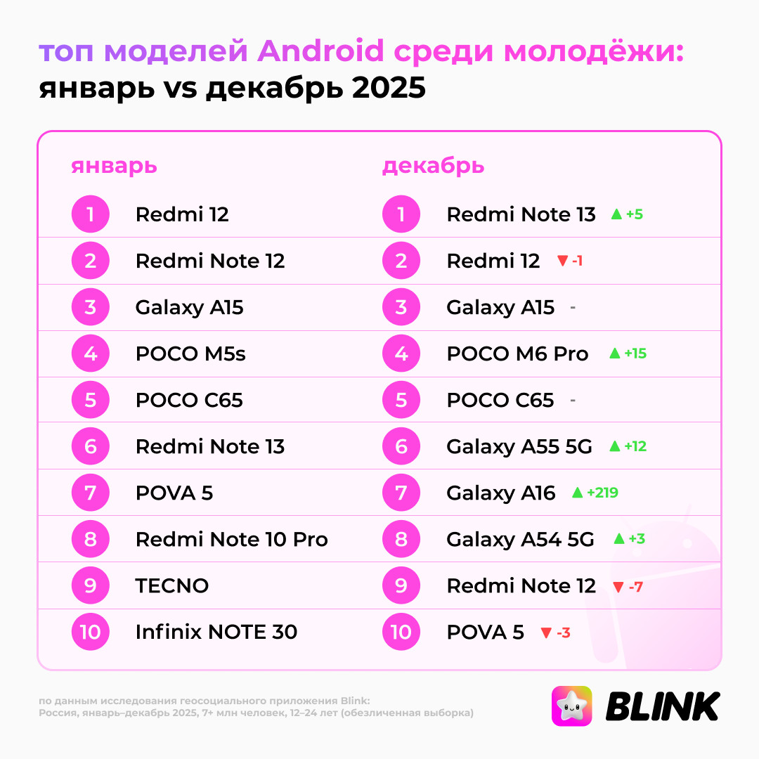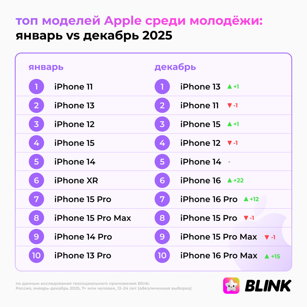 По данным Blink, в сегменте iOS-устройств у молодой аудитории произошла смена лидера: iPhone 13 поднялся на первое место, обойдя iPhone 11, который долгое время занимал доминирующую позицию. Линейка iPhone 16, 16 Pro и 16 Pro Max показала самый быстрый рост к концу года и вошла в десятку популярных моделей, поднявшись с низов рейтинга.