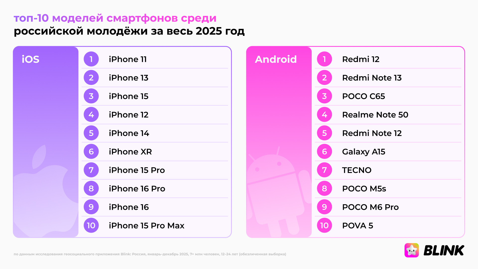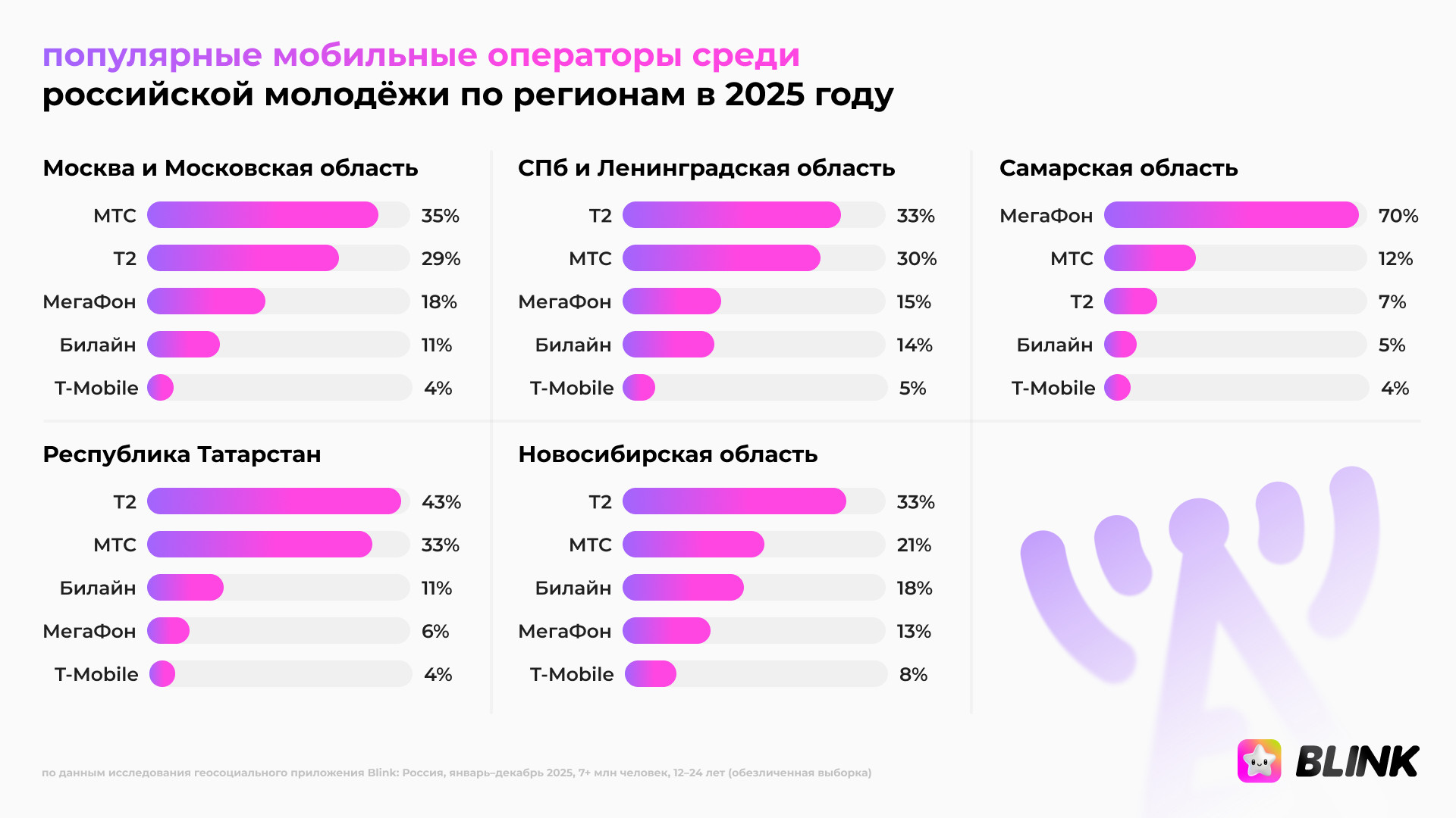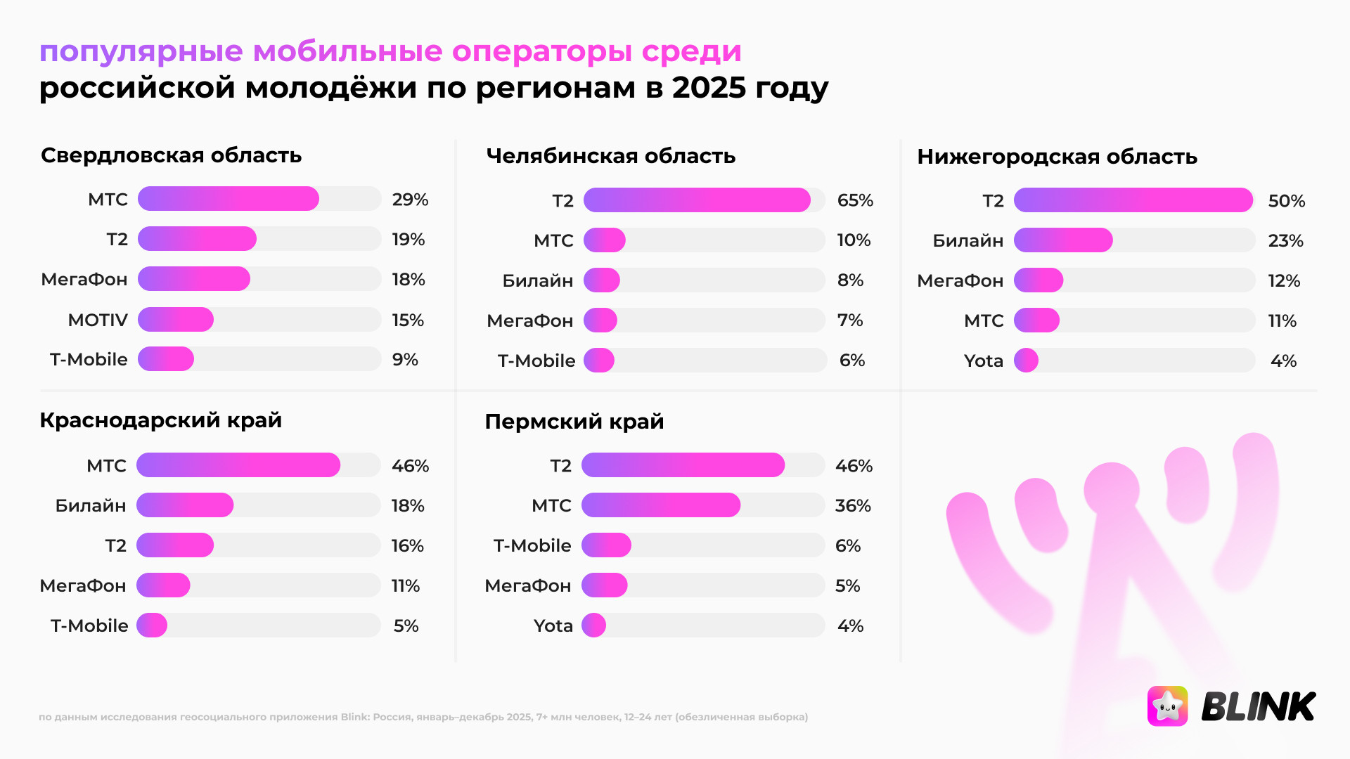Среди Android-устройств в декабре случились перестановки: стремительный рост продемонстрировал Redmi Note 13, который начал год шестым по счёту, а к декабрю стал самым популярным, обойдя Redmi 12. Большой скачок сделал Samsung Galaxy A16, попав в десятку из третьей сотни рейтинга. В течение года среди iOS-моделей чаще всего удерживал первую позицию iPhone 11 (19%), затем шли iPhone 13 (15%), iPhone 15 (7%), iPhone 12 (7%) и iPhone 14 (5%). В рейтинге топ-10 сохранили позиции: iPhone XR (5%), серия iPhone 15 Pro (4%), iPhone 15 Pro Max (3%). Android остался более фрагментированным. Каждая из ключевых моделей — Redmi 12, Redmi Note 13, POCO C65, Realme Note 50, Redmi Note 12 и Galaxy A15 — имеет около 2%. При этом POCO и Tecno сохраняют стабильные доли свыше 1%. Топ операторов среди молодёжи за 2025 год Согласно данным Blink, по итогам 2025 года рынок мобильной связи среди молодых людей возглавляет Т2 с долей 32%, за ним следует МТС — 25%, МегаФон и Билайн сравнялись — 15% каждый. Билайн потерял 1% во втором полугодии. Дальше идут Yota (6%), T‑Mobile (4%), а MOTIV остаётся практически локальным игроком — его доля по стране составляет менее 1%. Статистика популярности операторов среди молодёжи отличается в зависимости от региона. Так, Т2 особенно часто пользуются в Челябинской области (65%), Нижегородской области (50%), Пермском крае (46%) и Татарстане (43%). В свою очередь МТС распространён среди поколения Z в Краснодарском крае (46%), Пермском крае (36%), Москве и Московской области (35%). Особенно МегаФон популярен в Самарской области, где оператор обслуживает около 70% молодых абонентов региона. В Москве и Московской области и Свердловской области его доля — 18% соответственно. Билайн занимает уверенную позицию в Нижегородской области — 23%, в Новосибирской области (18%) и Краснодарском крае (18%). Больше всего T-Mobile пользуется успехом у представителей поколения Z в Свердловской (9%) и Новосибирской (8%) областях, а также Челябинской области (6%) и Пермском крае (6%). Оператор Yota чаще, чем в других регионах, используется в Новосибирской области (7%), а также в Санкт-Петербурге и Ленинградской области, Нижегородской области, Краснодарском и Пермском краях — в каждом из этих регионов доля составляет 4%. Активность MOTIV традиционно сосредоточена в Свердловской области (15%). Осенью 2025 года интерактивная карта друзей Blink запустила аудио- и видеозвонки. Согласно аналитике, пользователи младше 17 лет совершают более 40% всех созвонов. Доли аудиторий 18–24 лет и старше 25 лет примерно равны — около 30% каждая. Это говорит о том, что молодые люди созваниваются не реже старших поколений.