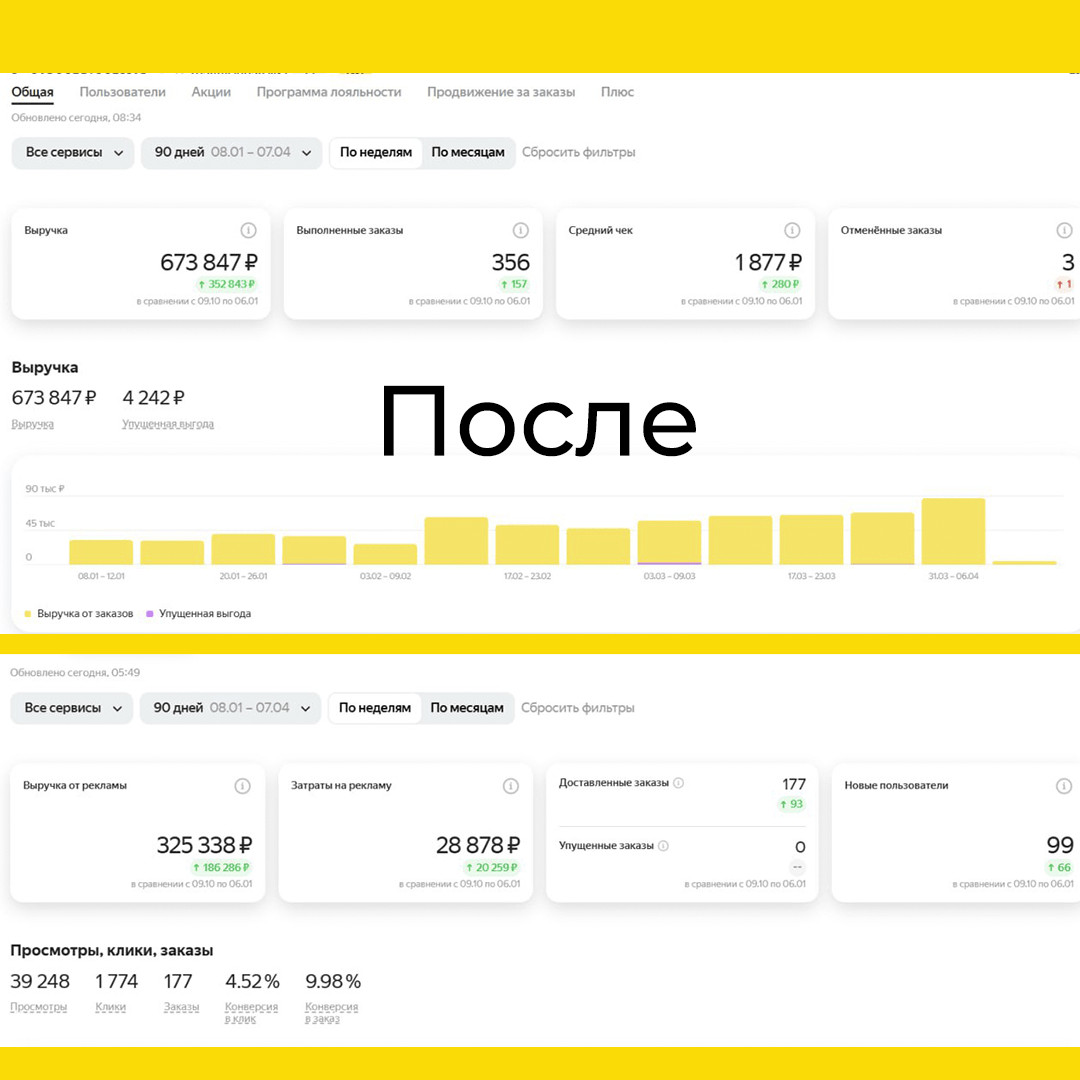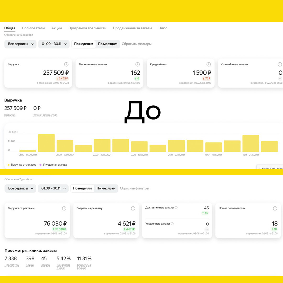 Убрали дублирующиеся страницы ресторанов, чтобы не дробить трафик. Результаты после нашей работы: Общая выручка 673 847 руб. Выручка с рекламы 325 338 руб. Новых пользователей 156 Заказов 356 Место в поиске 56 Почему это сработало?Рост в 2.6x по выручке — за счет фокуса на высокомаржинальные позиции и снижения возвратов. Улучшение позиции в поиске с 101 на 56 — благодаря SEO-оптимизации карточек и повышению CTR (кликабельности) из-за новых фото. Увеличение новых пользователей — за счет УТП, который выделил ресторан среди конкурентов. Сайт: https://spacereputation.ru/ Еще больше кейсов в нашем Телеграм-канале: Space Reputation — Маркетинговое агентство