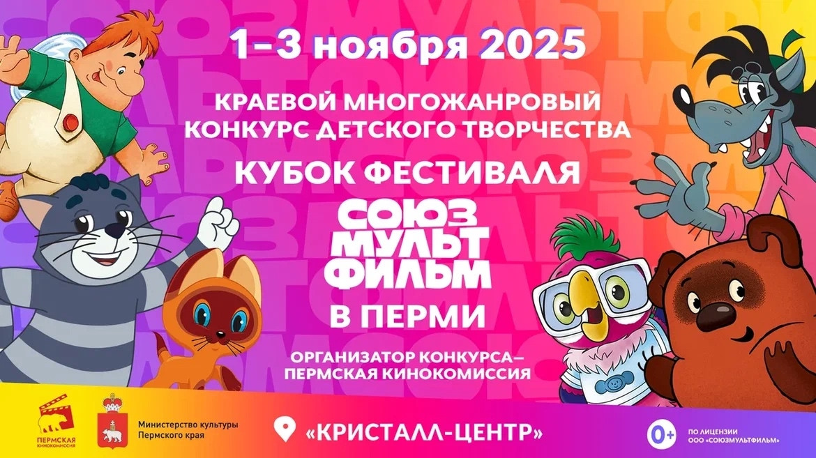 С 1 по 3 ноября 2025 года в Перми на площадке Кристалл-центра проходит большой анимационный фестиваль для детей «Союзмультфильм».