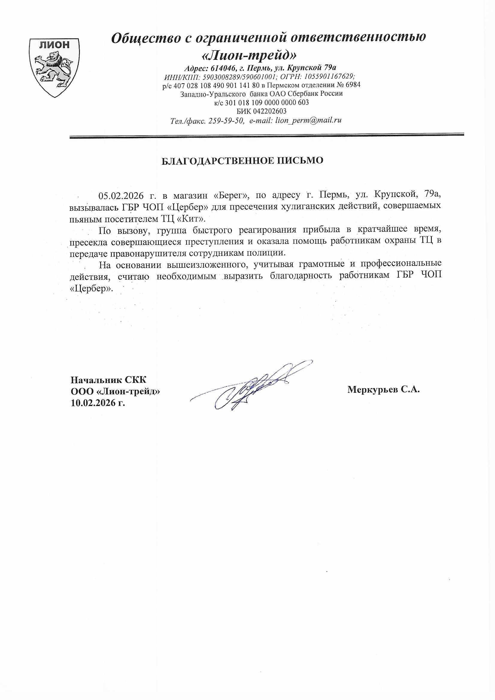 В адрес руководства компании Цербер поступило Благодарственное письмо за подписью Начальника СКК ООО «Лион-трейд» Меркурьева Сергея Анатольевича.