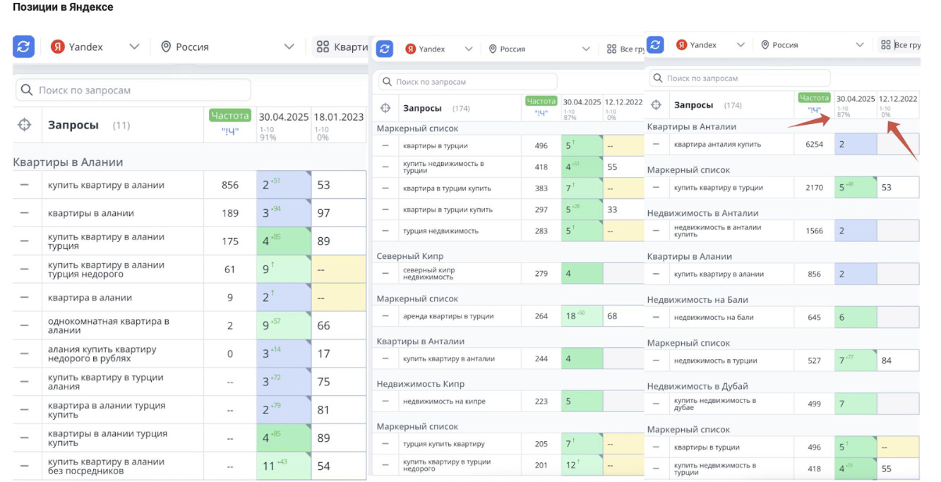 С января по март 2023 года мы устранили дубли страниц, настроили редиректы, оптимизировали внутреннюю перелинковку, провели полный аудит и начали работу над первыми приоритетными кластерами — например, «Купить квартиру в Алании».