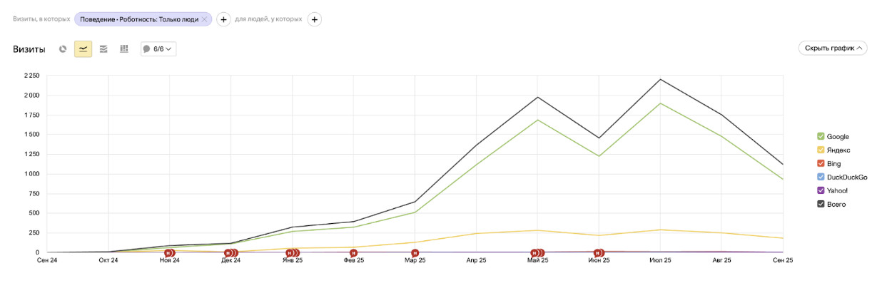 С марта по август 2025 года мы сосредоточились на охвате спроса. Оптимизировали более 25 страниц каталога под узкие запросы, например: «аренда внедорожника в Бишкеке», «прокат авто на свадьбу», «долгосрочная аренда автомобиля».