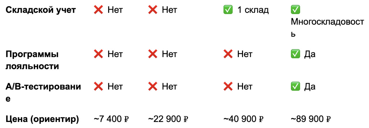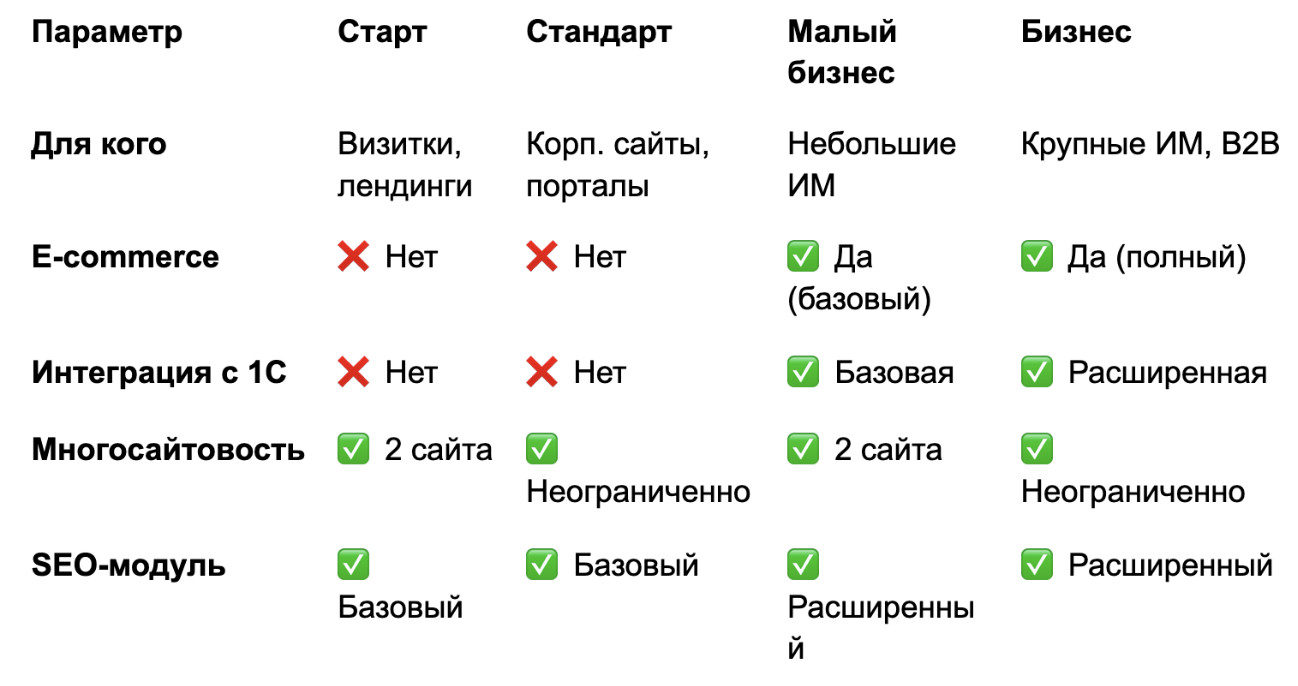 Здесь мы сравниваем всё: от базовых модулей и многосайтовости до тонкостей e-commerce, SEO-инструментов, складского учета и, конечно, цены.