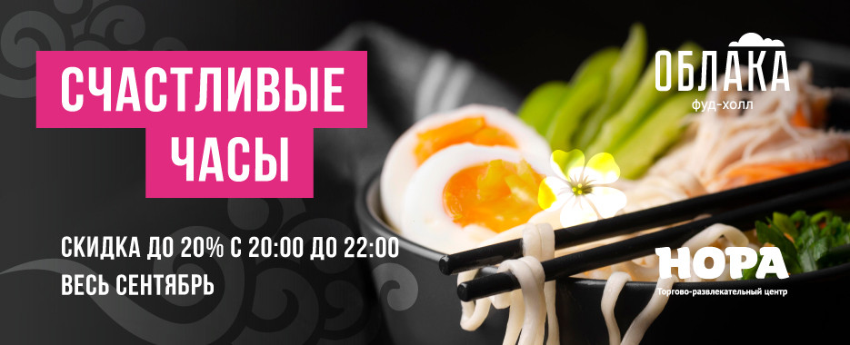 Акция «Счастливые часы» — это отличный повод собраться с друзьями или семьей после рабочего дня, попробовать новые блюда или насладиться уже полюбившимися, получив при этом приятную скидку. Подробности акции можно уточнить в кафе фуд-холла «Облака» в ТРЦ «Нора».