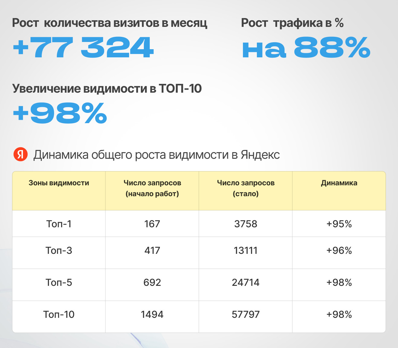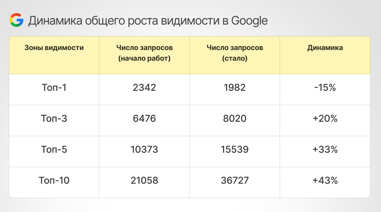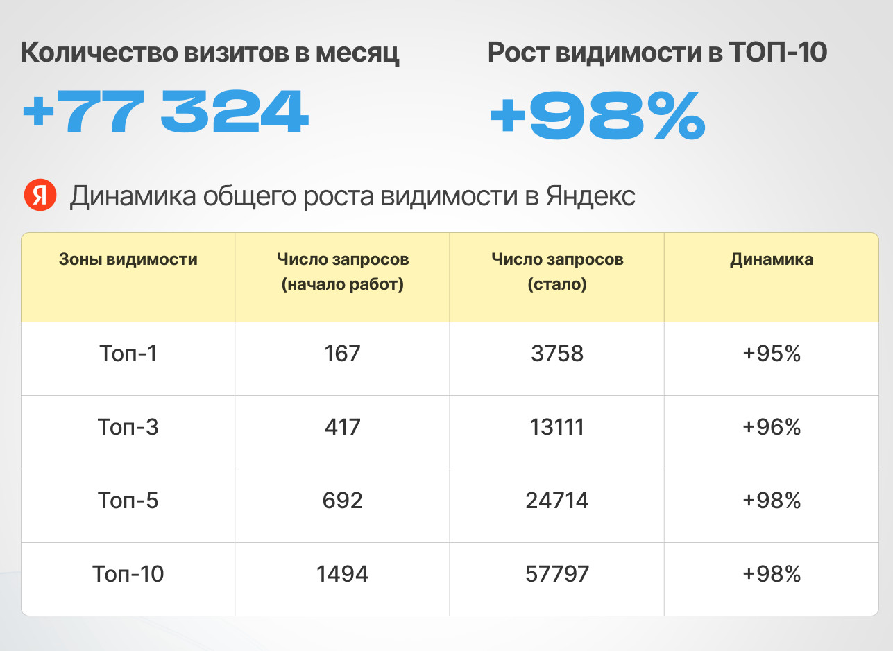 - Увеличение видимости в ТОП-10: Яндекс — +98%, Google — +43%.