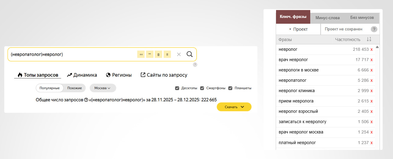 Провели комплексную работу по сбору и анализу целевого семантического ядра, что стало основой для дальнейшей оптимизации сайта. В процессе работы мы оценили частотность, коммерческую привлекательность и конкурентность ключевых фраз, а затем провели их кластеризацию. Семантическое ядро собиралось для существующих страниц направлений врачей, страниц диагностики и медицинских услуг, с учетом необходимости создания новых страниц в этих разделах.