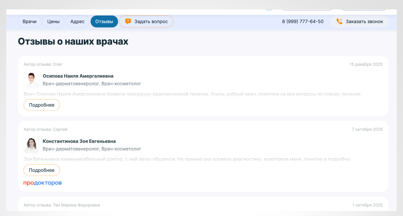 - На страницах не хватало элементов, помогающих пользователю принять решение о записи на прием: ответов на вопросы, поясняющих блоков, отзывов, прайсов.