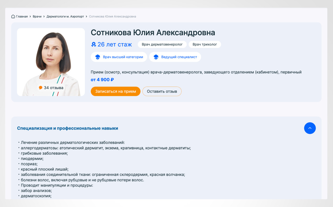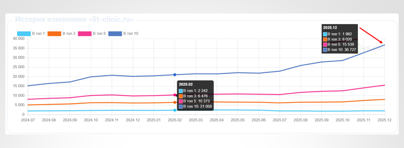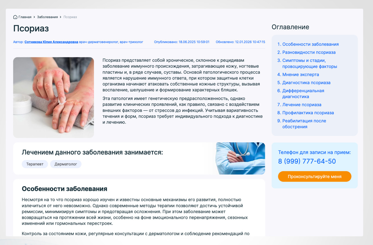 5. Корректировка тематической перелинковки В контексте SEO для медицинских сайтов корректировка тематической перелинковки является ключевым аспектом для улучшения внутренней структуры сайта и его видимости в поисковых системах. Перелинковка позволяет устанавливать логические связи между страницами разного типа, что играет важную роль в улучшении навигации для пользователей и поисковых систем. Медицинские сайты часто охватывают широкий спектр информации: от страниц о врачах и медицинских услугах до подробных описаний заболеваний, диагностических процедур и методов лечения. В таком случае, правильная тематическая перелинковка помогает не только улучшить юзабилити, но и организовать информацию таким образом, чтобы поисковые системы могли эффективно индексировать и ранжировать страницы. 6. Повышение экспертизы в контенте страниц разного типа В сфере медицины, особенно в контексте сайтов, относящихся к категории YMYL (Your Money Your Life), крайне важно не только раскрытие основных факторов E-E-A-T Experience (Опыт), Expertise (Экспертность), Authoritativeness (Авторитетность) и Trustworthiness (Надежность), но и акцент на демонстрацию высокой экспертизы. Это особенно актуально для сайтов, предоставляющих медицинские услуги, информацию о заболеваниях, а также профили врачей, где доверие и авторитет имеют решающее значение для пользователей и поисковых систем. Как мы повышали экспертизу контента: 6.1. Страницы направлений врачей, обследований и диагностических процедур Мы готовили SEO-тексты, которые детально описывают услуги, включая методы лечения, показания и противопоказания, а также ссылки на актуальные научные исследования. Это повышает доверие пользователей и релевантность страницы для поисковых систем. Также проводили работу: 6.2. Корректировка и добавление полноценных прайсов Мы обновили прайс-листы, уточнив стоимость услуг и добавив подробные описания. Разметка прайсов с использованием структурированных данных улучшила видимость в поисковых системах. 6.3. Вывод отзывов пациентов Мы добавили вывод отзывов на страницах услуг и профилях врачей, что укрепляет доверие и демонстрирует открытость клиники. Мы также оптимизировали разметку отзывов для поисковых систем. 6.4. Добавление раздела «Вопросы-Ответы» Мы создали раздел FAQ на страницах услуг и профилях врачей, чтобы помочь пользователям найти ответы на самые распространенные вопросы, улучшая вовлеченность и удовлетворенность. 6.5. Страницы врачей В карточках врачей добавили информацию о квалификации, профессиональных достижениях и участии в научных исследованиях, что повышает доверие к специалистам и клинике в целом. 6.6. Экспертная проработка блога Мы активно развивали блог, создавая статьи на актуальные медицинские темы, а также интервью с врачами и экспертами. Это улучшает восприятие сайта как авторитетного источника и способствует лучшему ранжированию страниц в поисковых системах. 6.7. Экспертная проработка страниц заболеваний Каждая страница, посвященная заболеванию, была проработана с учетом последних медицинских исследований и рекомендаций. Включены подробные описания симптомов, методов диагностики и лечения, что помогает пользователям получить точную и полезную информацию: В результате SEO-продвижения сайт клиники превратился из вспомогательного ресурса в полноценный канал привл