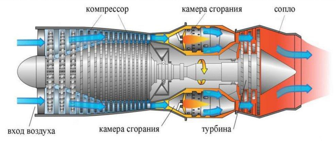 Газотурбинный двигатель (ГТД) — это воздушный двигатель, в котором воздух сжимается компрессором перед сжиганием в нём топлива, а сам компрессор приводится в движение газовой турбиной, использующей энергию нагретых газов. То есть сжатый воздух из компрессора поступает в камеру сгорания, куда подаётся топливо. Энергия освобождается из керосина в ходе сгорания, газообразные продукты горения с большей энергией ударяют в лопасти турбины. Затем в турбине часть энергии продуктов сгорания преобразуется во вращение турбины, которая расходуется на сжатие воздуха в компрессоре. Остальная часть энергии может передаваться на приводимый агрегат или использоваться для создания реактивной тяги.