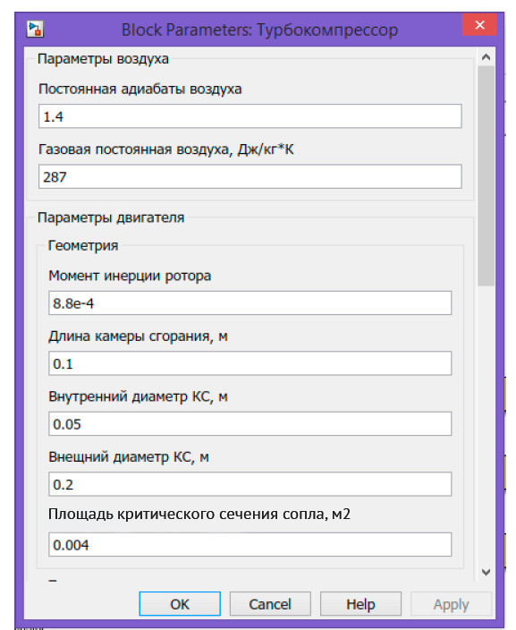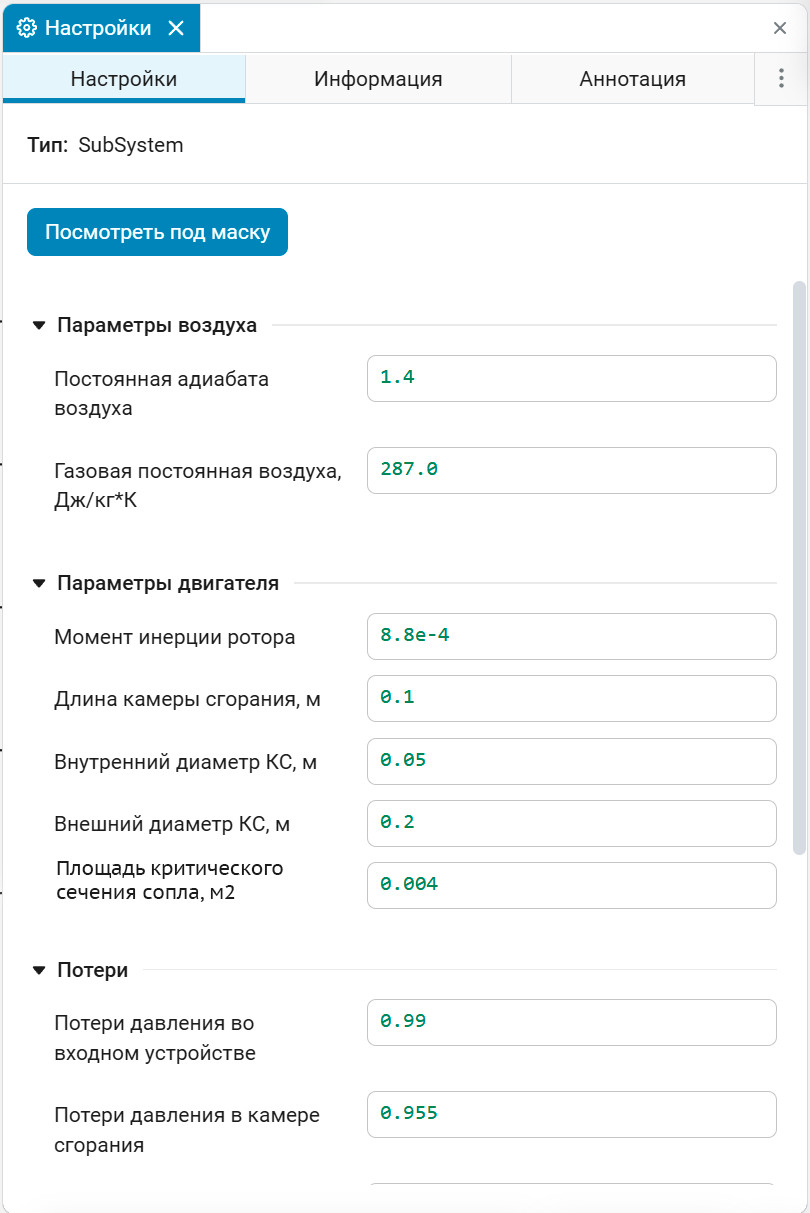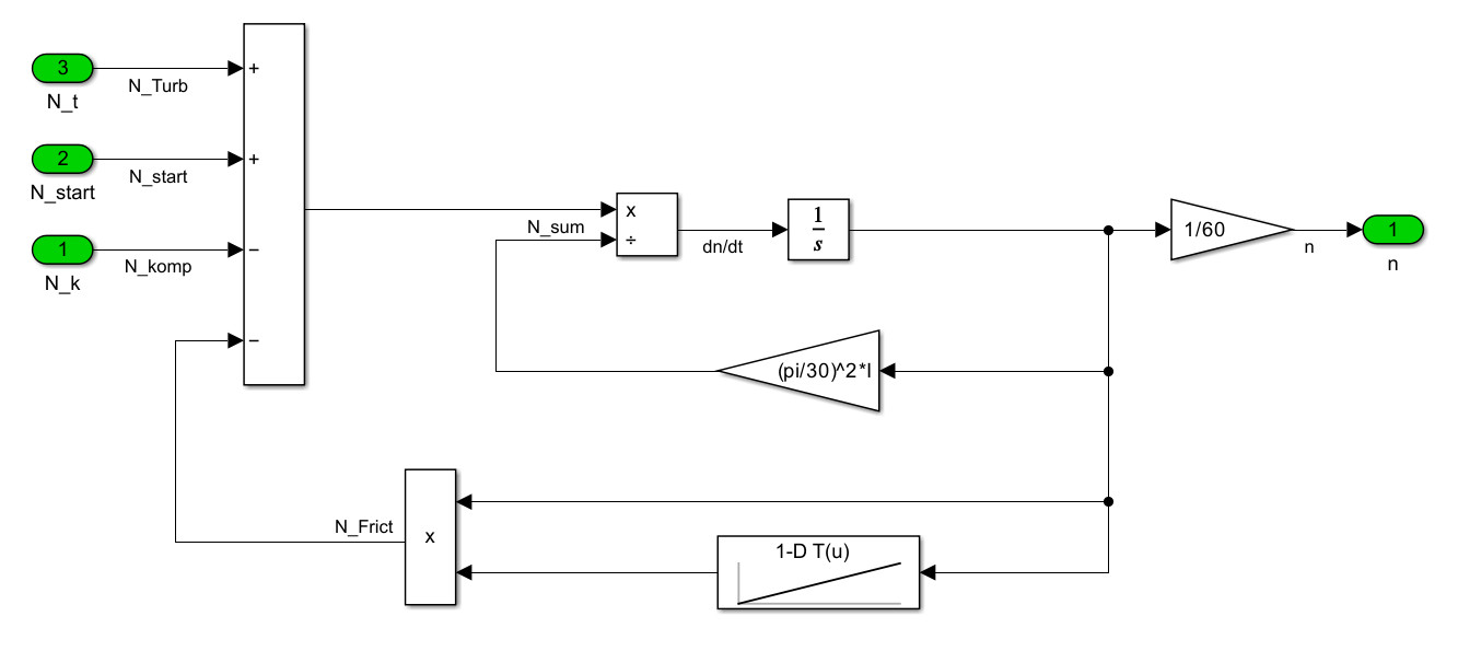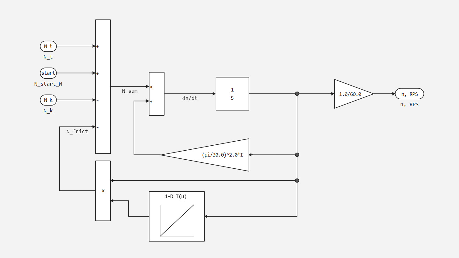 Основные структурные части ГТД изображены на рисунке ниже: Процессы, происходящие в каждой части ГТД описываются системами дифференциальных уравнений, при этом в 1D-постановке моделирования сознательно опускаются многие «тонкие места», рассчитываемые обычно с помощью конечно-элементных расчётов в ресурсоёмких CAE-программах. Традиционно 1D-моделирование применяется на системном уровне там, где необходимо быстро анализировать поведение системы или устройства во всех ожидаемых условиях и при возникновении возможных отказов. Перейдём к исходной математической модели нашего ГТД, реализованной в среде MATLAB/Simulink. Дабы не перегружать текст огромным количеством скриншотов исходной модели, посмотрим на общую структуру модели: Человеку, далёкому от моделирования в Simulink или в другом подобном ПО, может показаться, что это просто блок-схема со странными связями между объектами, но на самом деле каждый прямоугольник — это подсистема, внутри которой с помощью математики (чаще примитивной, но порой и достаточно сложной) описываются дифференциальные уравнения процессов, происходящих в разных частях системы, в нашем случае — газотурбинного двигателя. Например, уравнение динамики ротора выглядит вот так: Nт — мощность турбины, Вт Nст — мощность стартера, Вт Nк — мощность компрессора, Вт Nтр(n) =kтр(n)n — потери мощности на трение в зависимости от частоты вращения n , Вт. При этом коэффициент расчёта потерь мощности на трение kтр (Вт/(об/мин)) задан следующей табличной зависимостью: А вот как это же уравнение выглядит в соответствующем блоке модели: При этом значение каждого сигнала (читай, составляющей уравнения) может быть проанализировано для отладки во время или после симуляции. Подобным образом работают все составные части моделируемого ГТД. Глобально модель описывает поведение ГТД во времени в зависимости от количества подаваемого топлива и параметров окружающей среды (температура воздуха, давление и число Маха). Уравнения, заложенные в блоках, позволяют оценивать температуру и давление в каждой камере ГТД, развиваемые обороты, тягу двигателя и некоторые другие параметры работы. Но приводить их все в рамках этой краткой статьи мы, конечно, же не станем. Ещё из интересных особенностей исходной модели стоит отметить маску системы — специальный интерфейс, с помощью которого пользователю удобно задавать настройки для модели или её части. Выглядит в Simulink это вот так: Преимущество — наглядность используемых данных без необходимости многократного ручного задания параметров в модели. Это удобный функционал, который существенно снижает порог входа для вновь прибывших на проект инженеров. Исходя из описания исходной математической модели, первой задачей для участников проекта стал формальный перенос уравнений в среду моделирования Engee. Здесь нужно сделать отступление и описать стандартный процесс перехода из привычного ПО в другое, новое глазами инженера. Зачастую, даже при заявленных функциональных сходствах между зарубежным ПО и российскими аналогами, конечному пользователю необходимо пробиваться через «дружелюбный» интерфейс, читать тонны документации разной степени готовности (а зачастую пытаться найти хоть какую-то документацию среди страниц 404) и понять, как реализовать самые базовые вещи, к которым конкретный инженер при